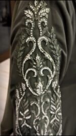 Crafted in a deep olive hue, this elegant silhouette showcases intricate silver embroidery, refined bead work, and ornate leafy motifs for a look that’s both regal and timeless.