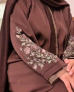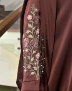 Crafted in a deep rosewood hue, this graceful silhouette features intricately embroidered sleeves adorned with floral motifs.