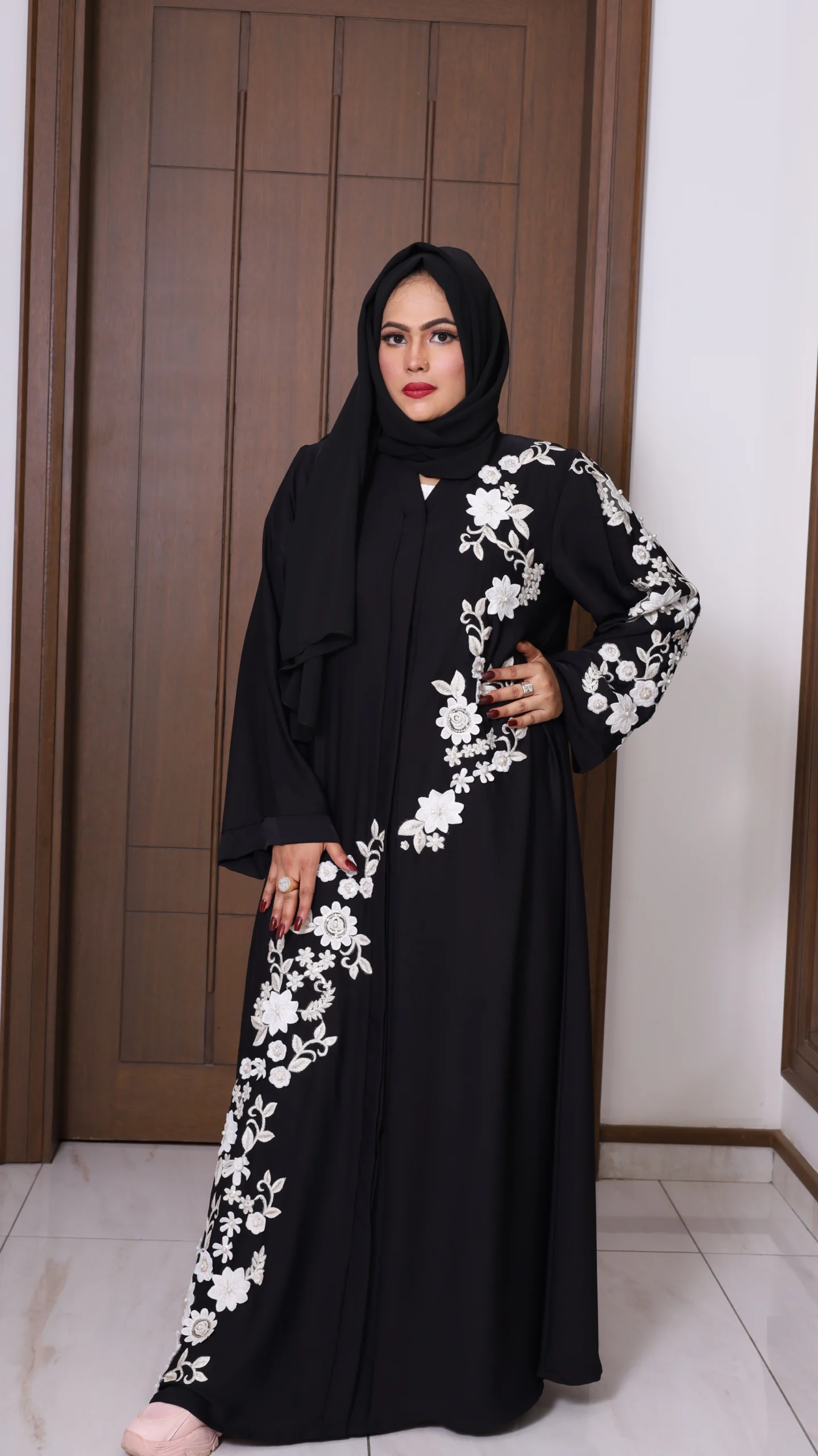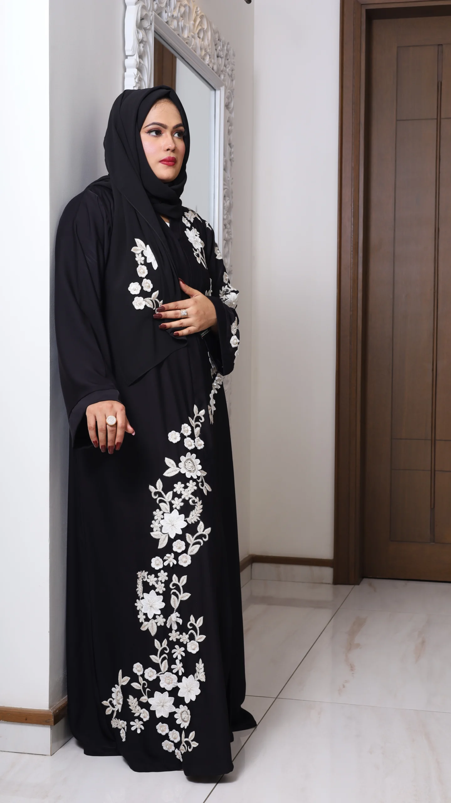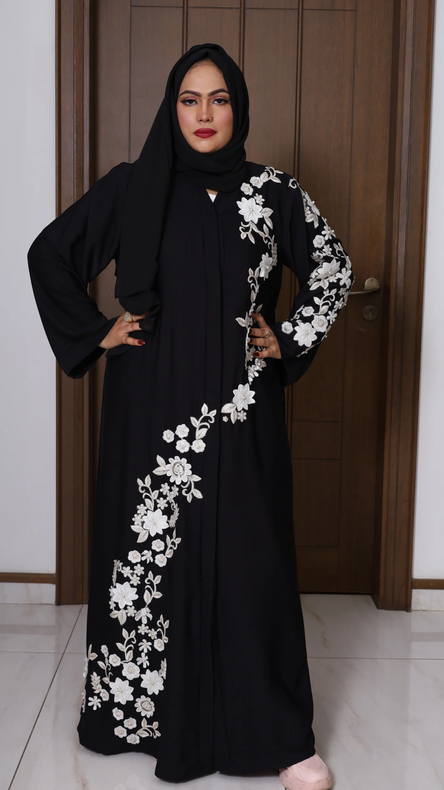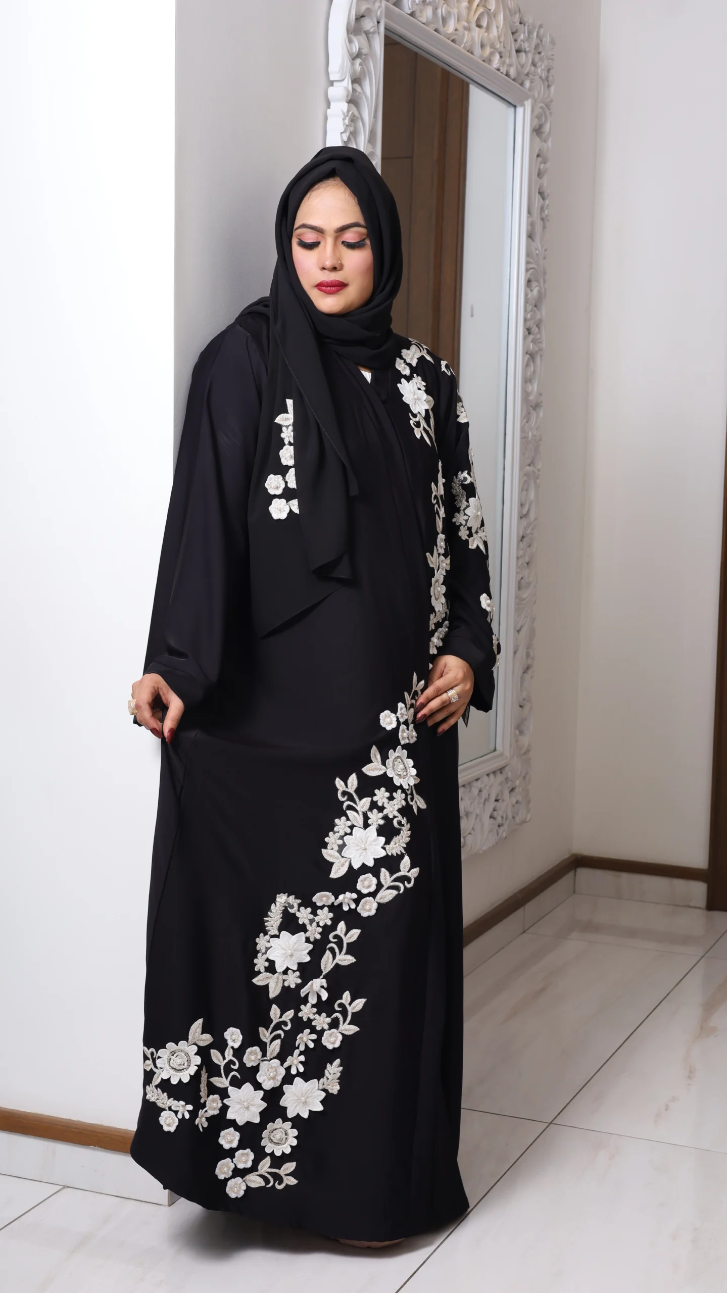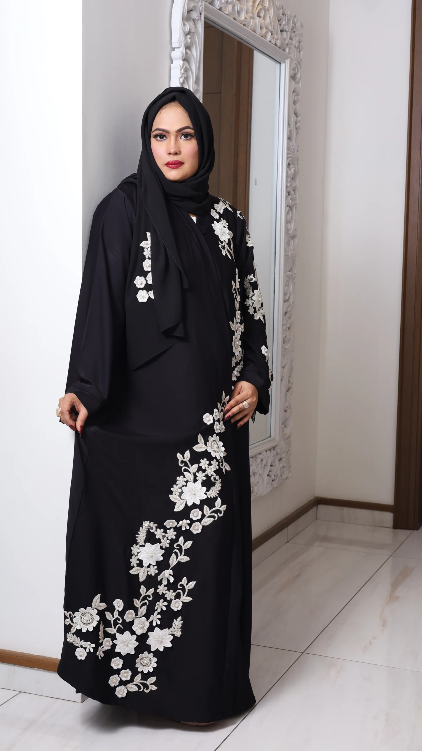 Embrace the allure of understated elegance with the Midnight Bloom Abaya. This isn’t just an abaya; it’s a statement in monochrome poetry. Imagine the whisper of midnight gardens rendered in delicate white embroidery against a canvas of deepest black.