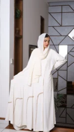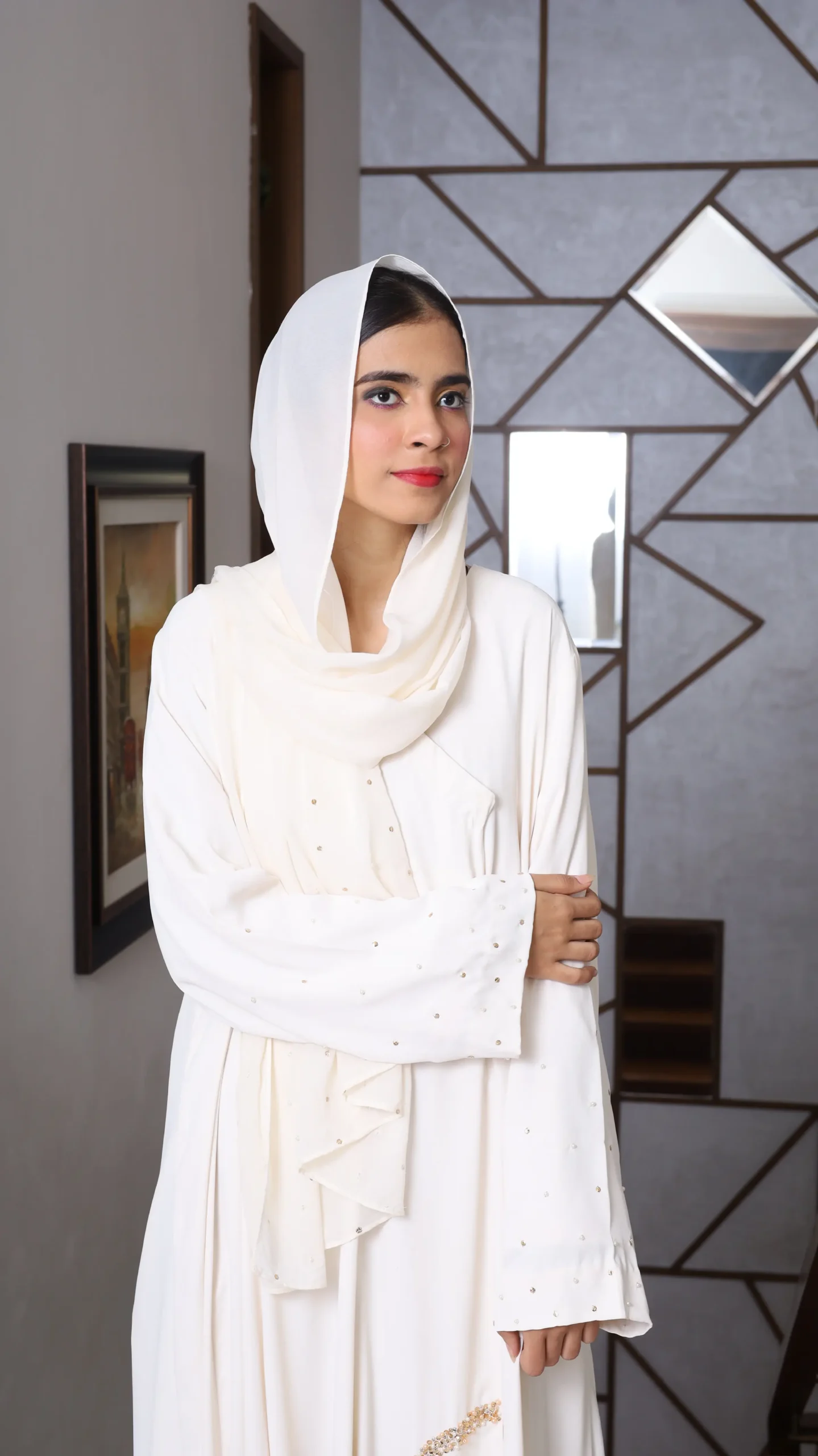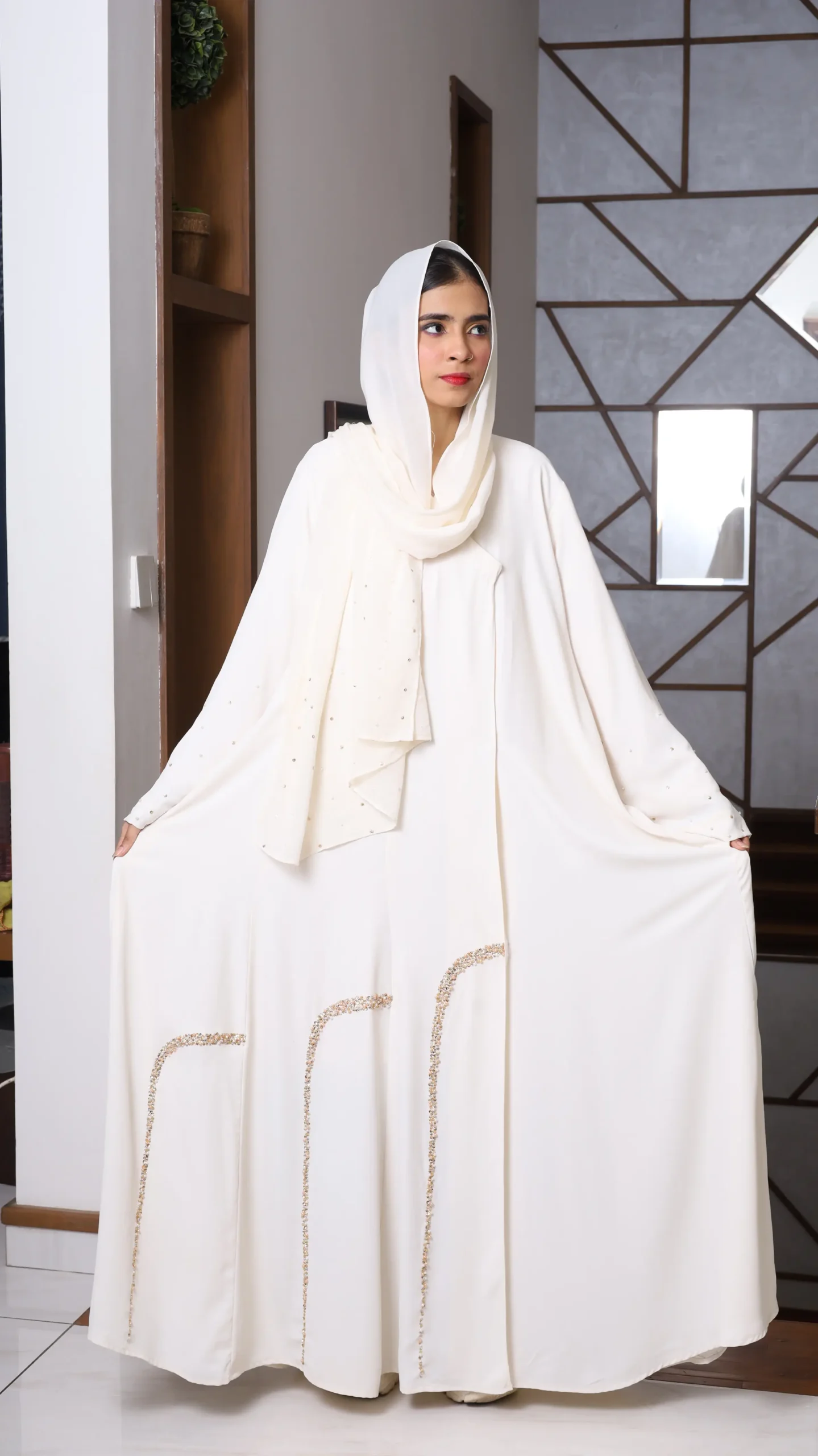 Three delicate strands of golden embroidery adorn the front, their subtle curves echoing the gentle sway of your movements. Tiny, scattered pearls glimmer on the matching hijab, catching the light with every turn. Crafted from the lightest, most breathable fabric, this abaya feels like a gentle caress against your skin, ensuring effortless comfort from dawn till dusk.