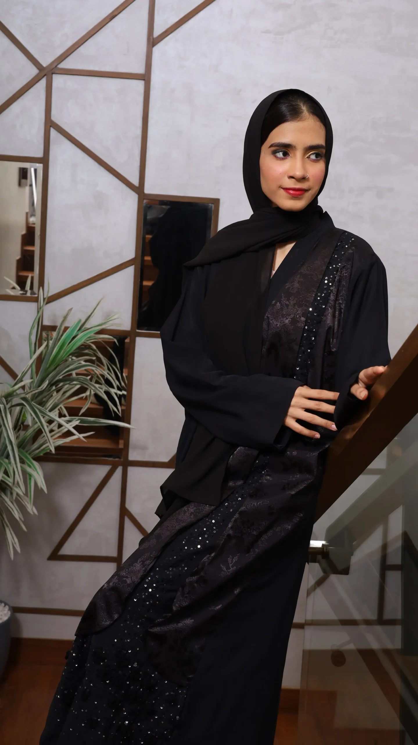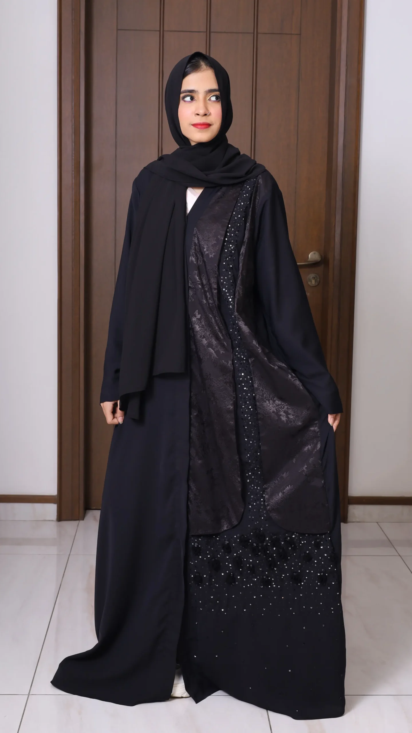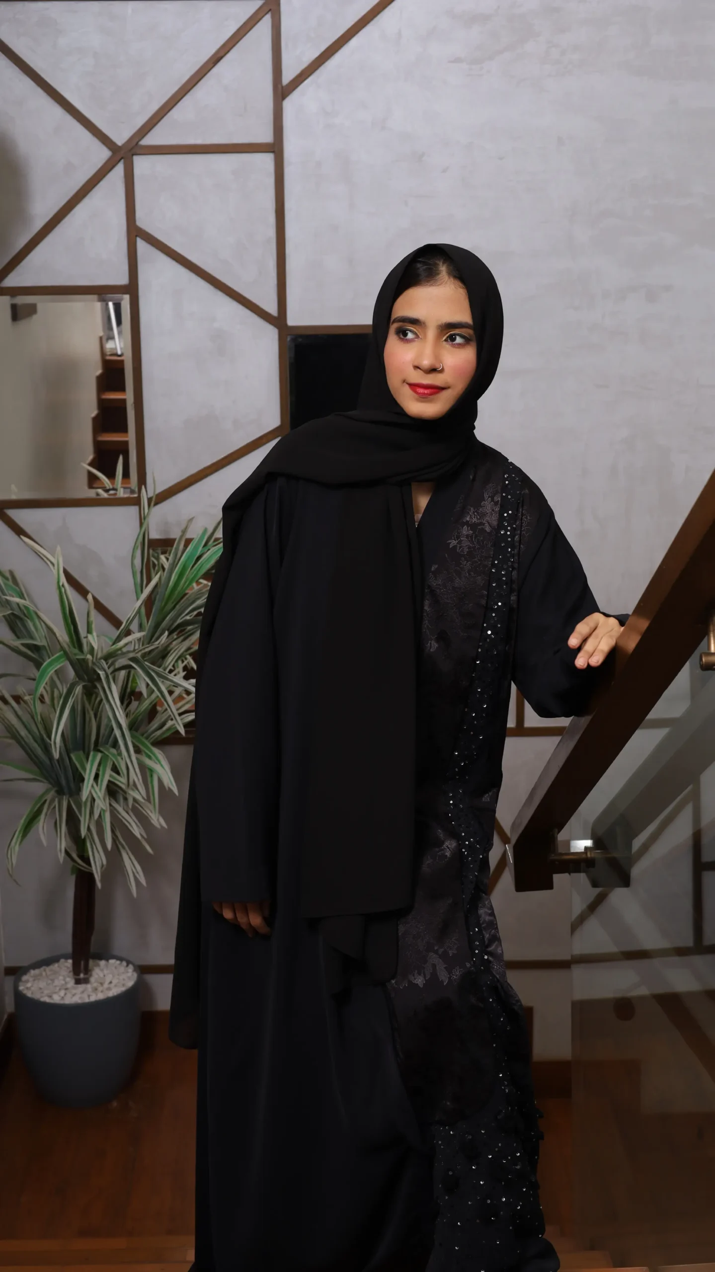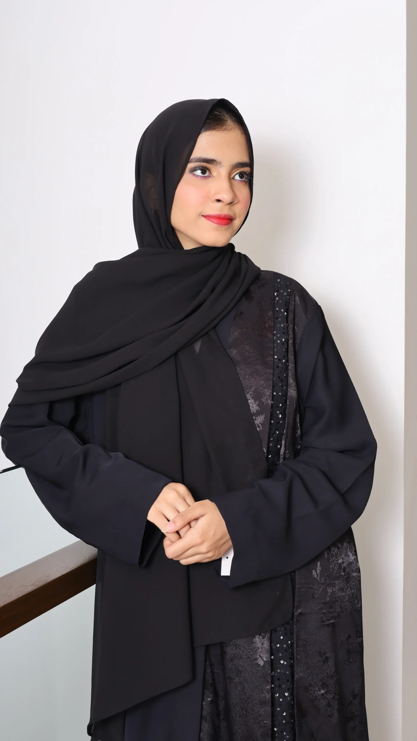 Embrace the quiet power of the night with our Deepest Black Embroidered Abaya. This two-piece ensemble drapes you in an aura of timeless elegance. The flowing outer cloak, crafted from the richest black fabric, whispers of modesty and grace with every movement.