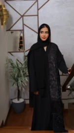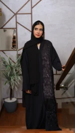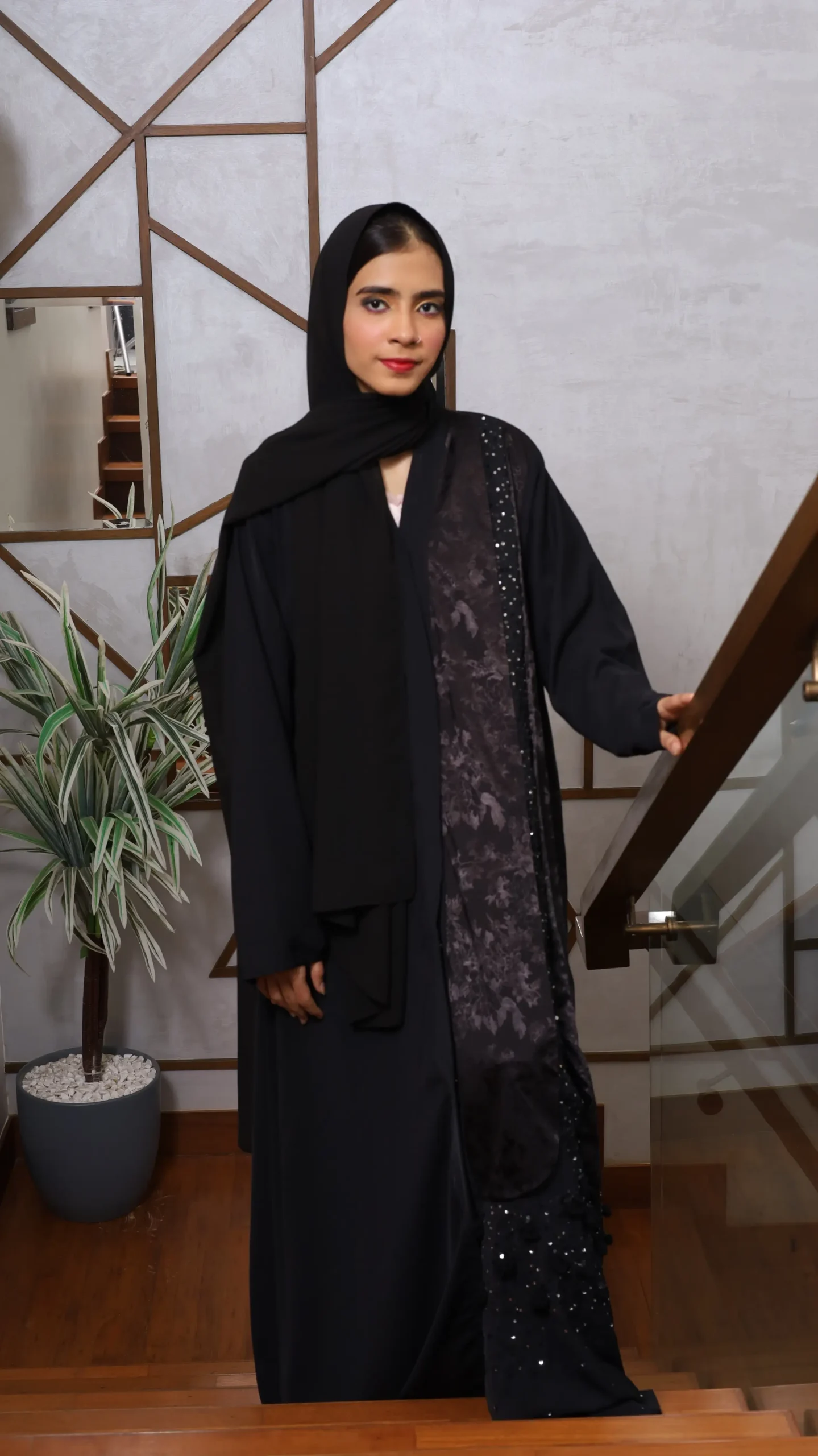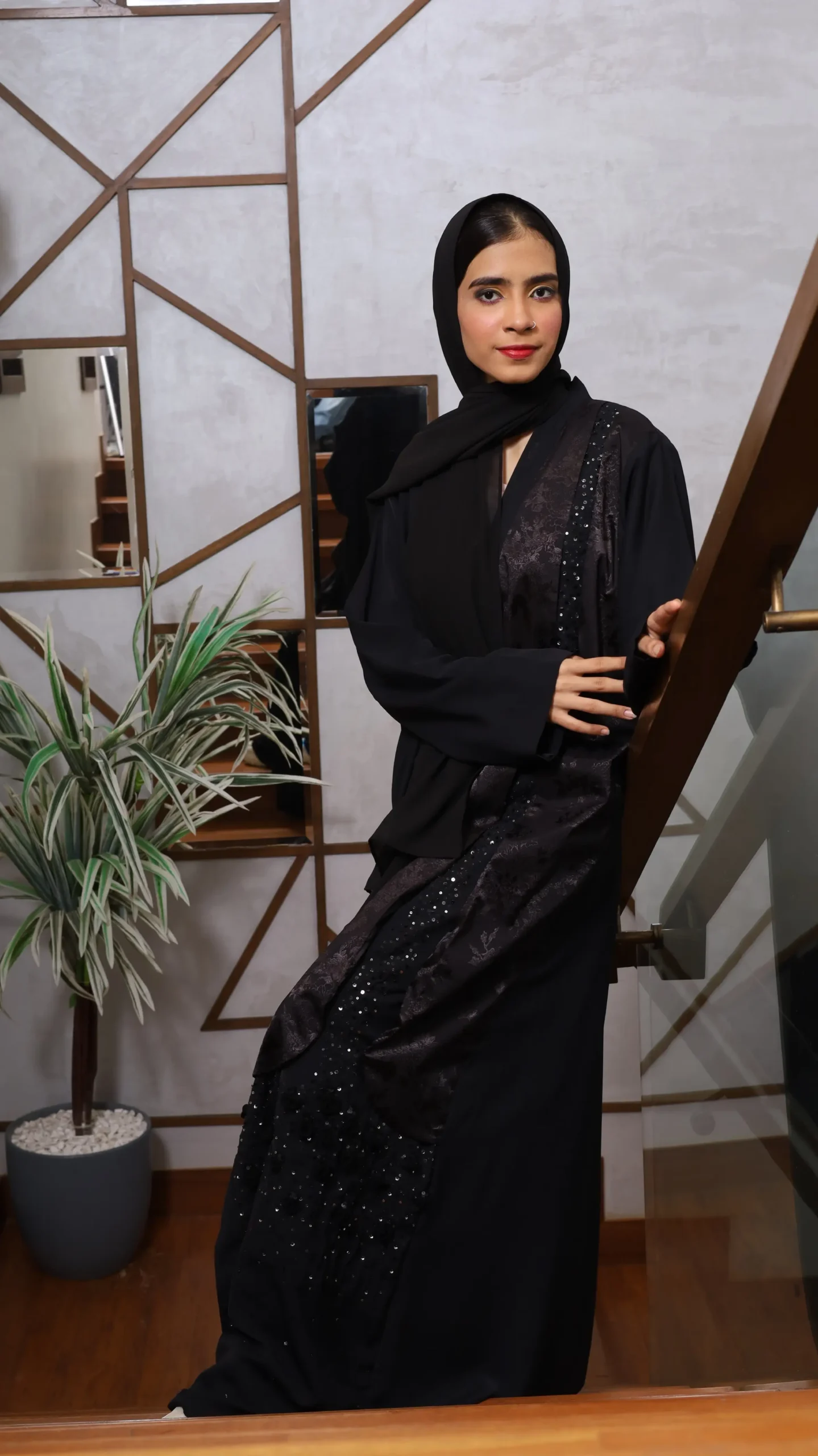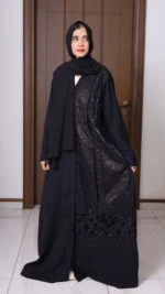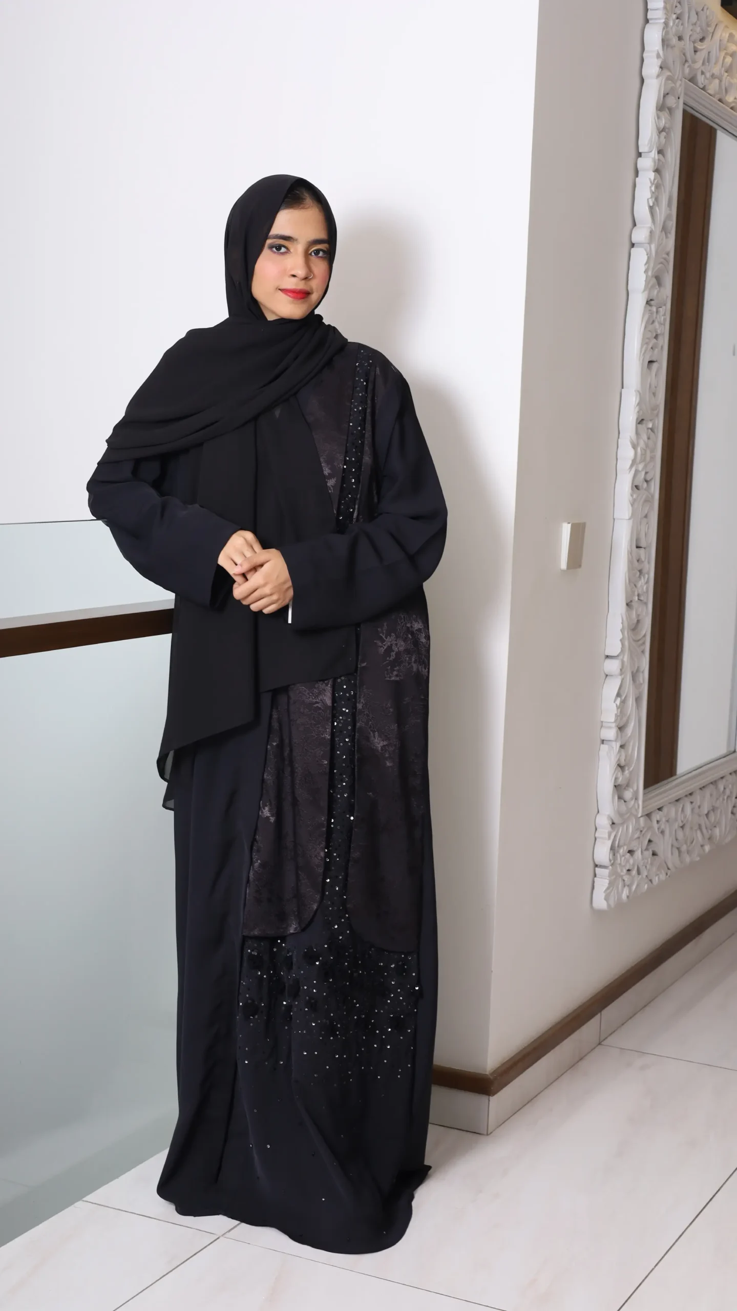 Embrace the quiet power of the night with our Deepest Black Embroidered Abaya. This two-piece ensemble drapes you in an aura of timeless elegance. The flowing outer cloak, crafted from the richest black fabric, whispers of modesty and grace with every movement.