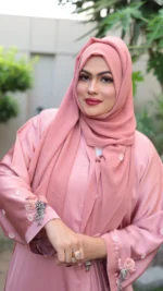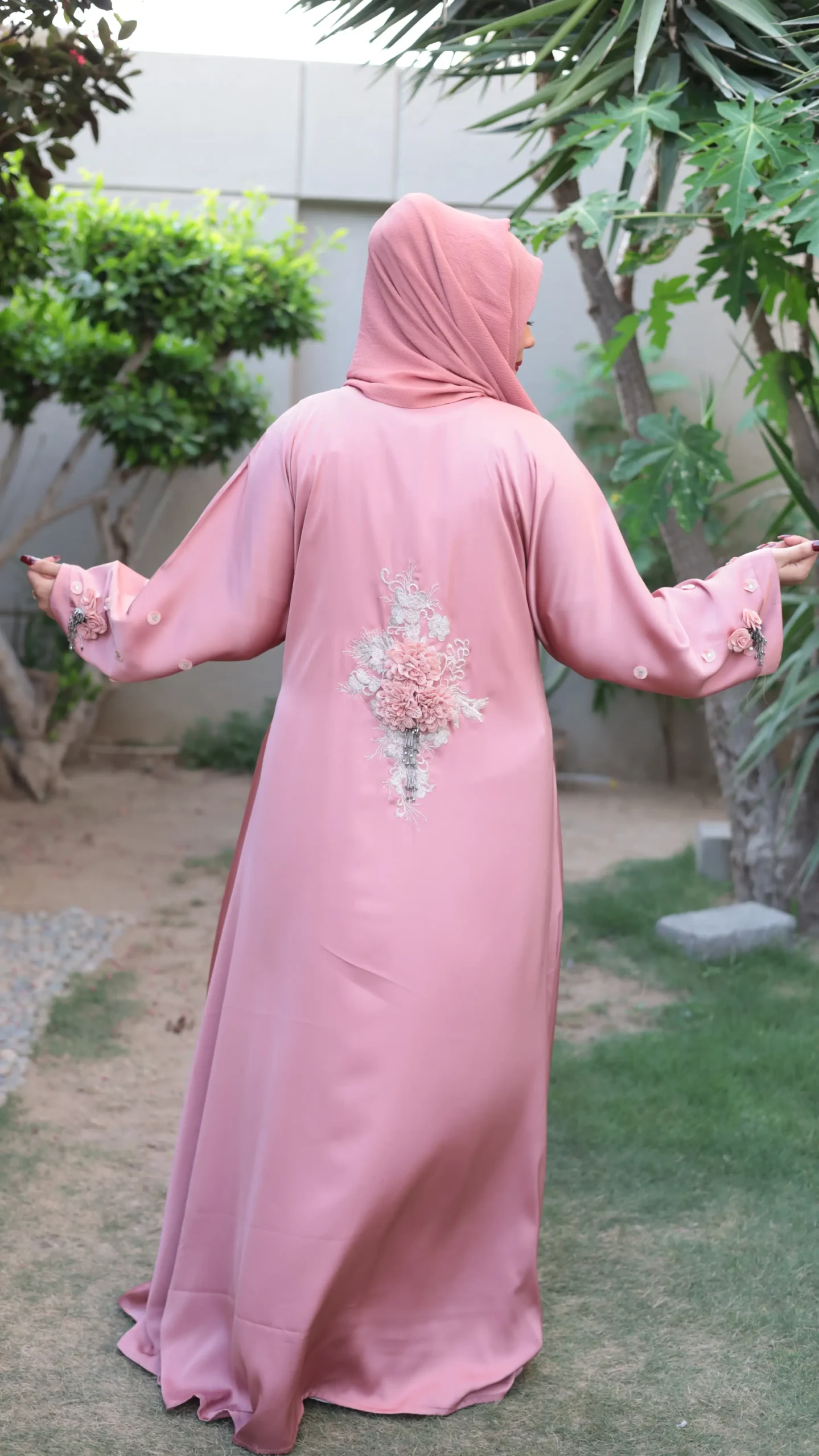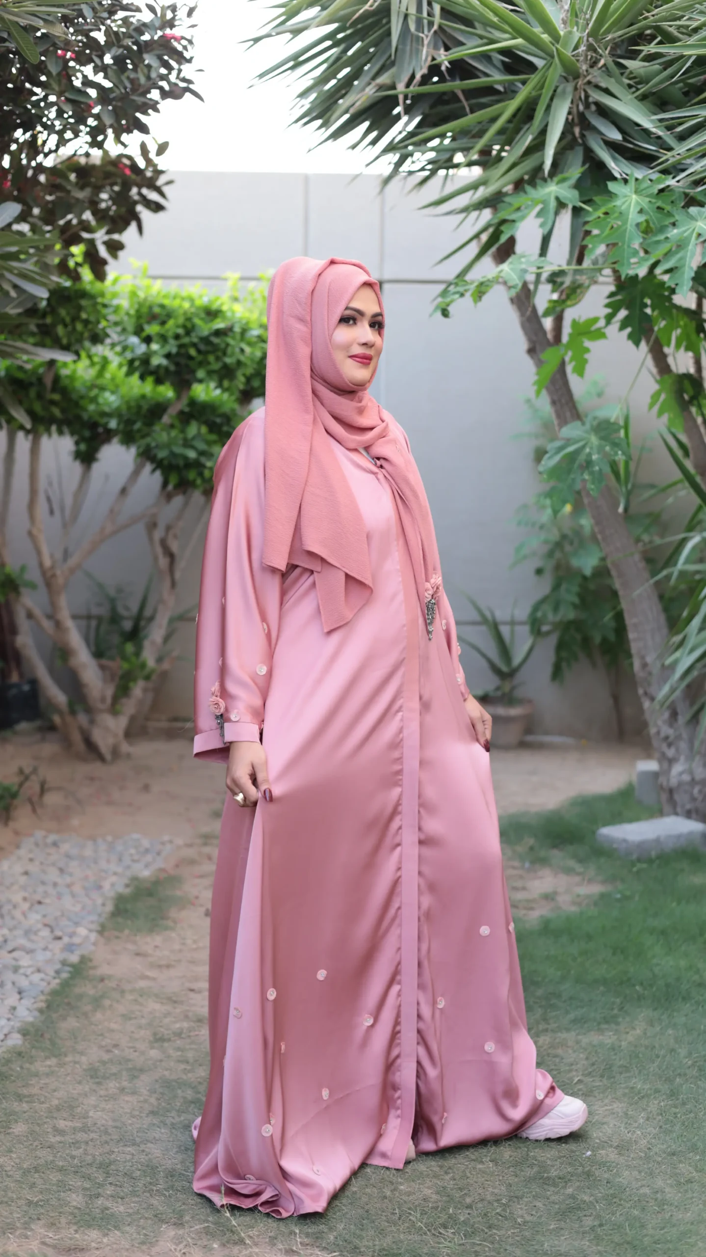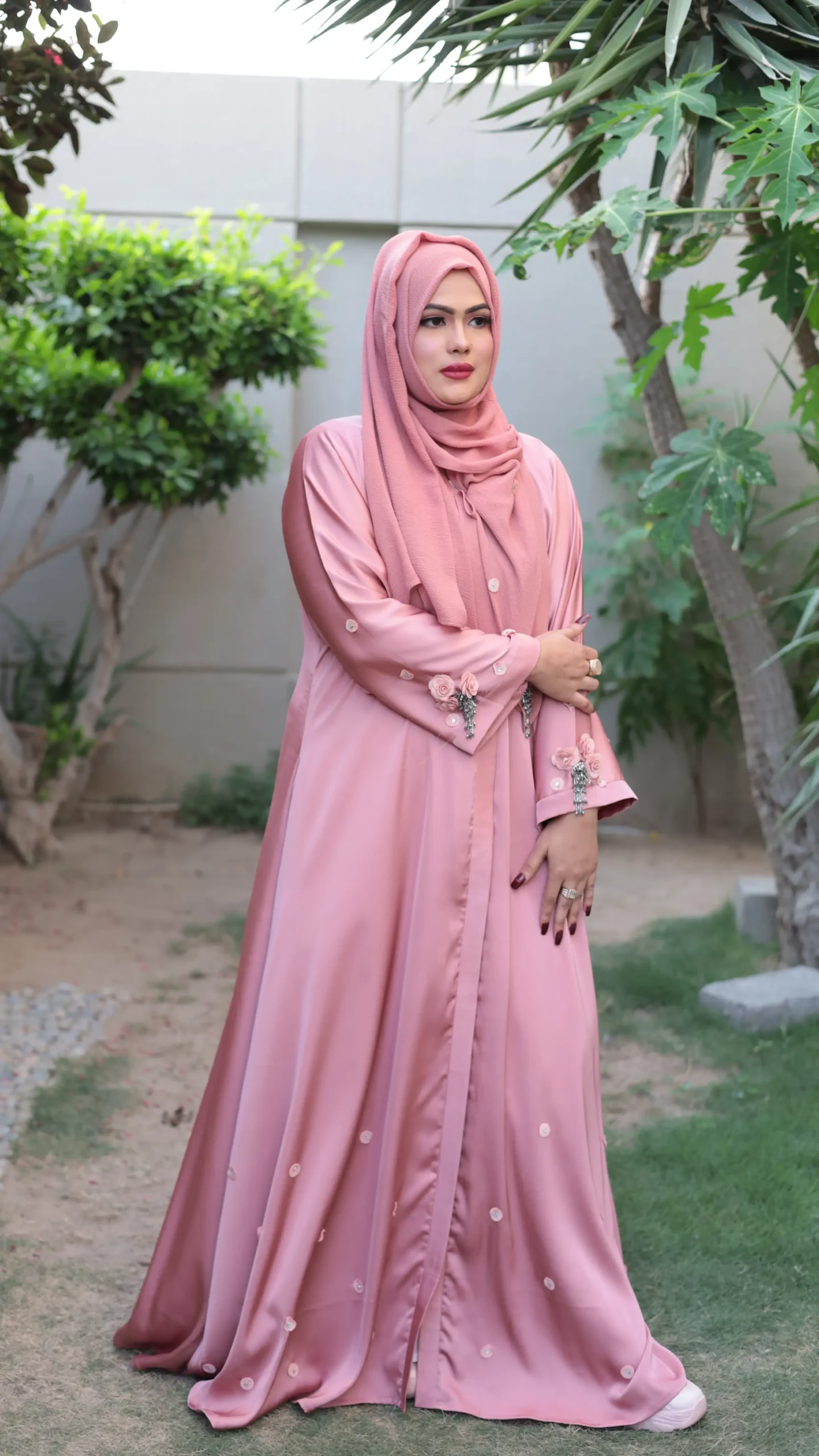Embrace timeless elegance with our Dusty Rose Abaya Dress. Crafted from a luxuriously smooth fabric with a subtle sheen, this abaya drapes beautifully, offering a graceful and modest silhouette. Delicate, scattered embellishments add a touch of understated sparkle. The matching rose-colored hijab completes the look, creating a cohesive and sophisticated ensemble. The sleeves feature a contrasting rose panel adorned with intricate floral appliques, adding a unique and feminine detail. Perfect for special occasions or elevating your everyday style, this abaya is a testament to refined beauty and enduring grace.