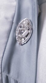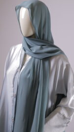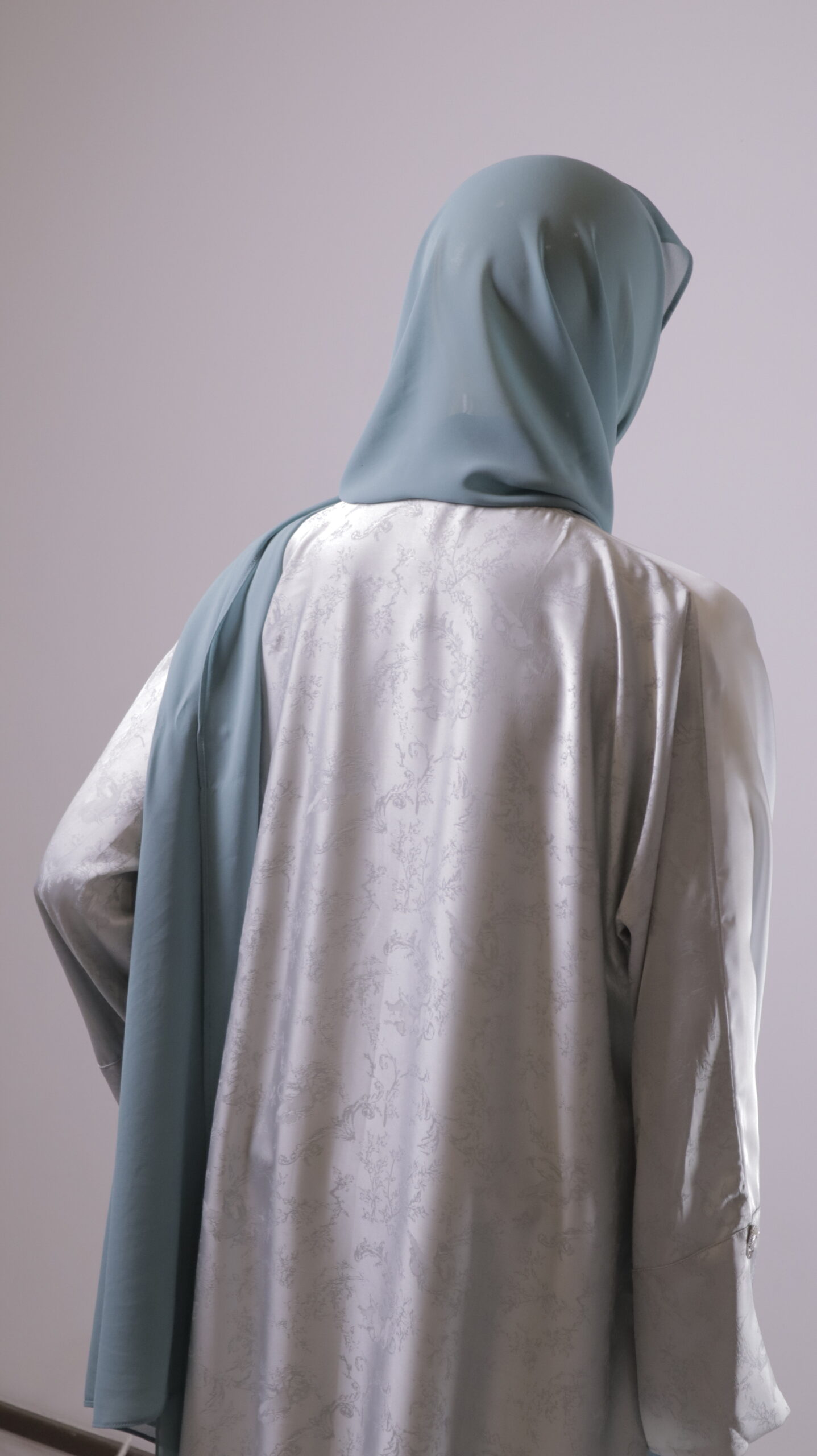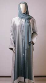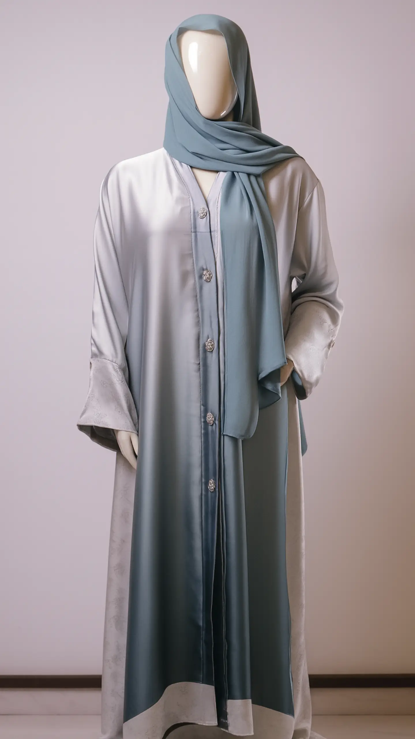 Crafted in a two-tone blend of soft grey and teal, this abaya exudes modern modest elegance. Featuring embellished buttons, flared sleeves, and a matching teal hijab, it’s perfect for effortless sophistication on any occasion.
