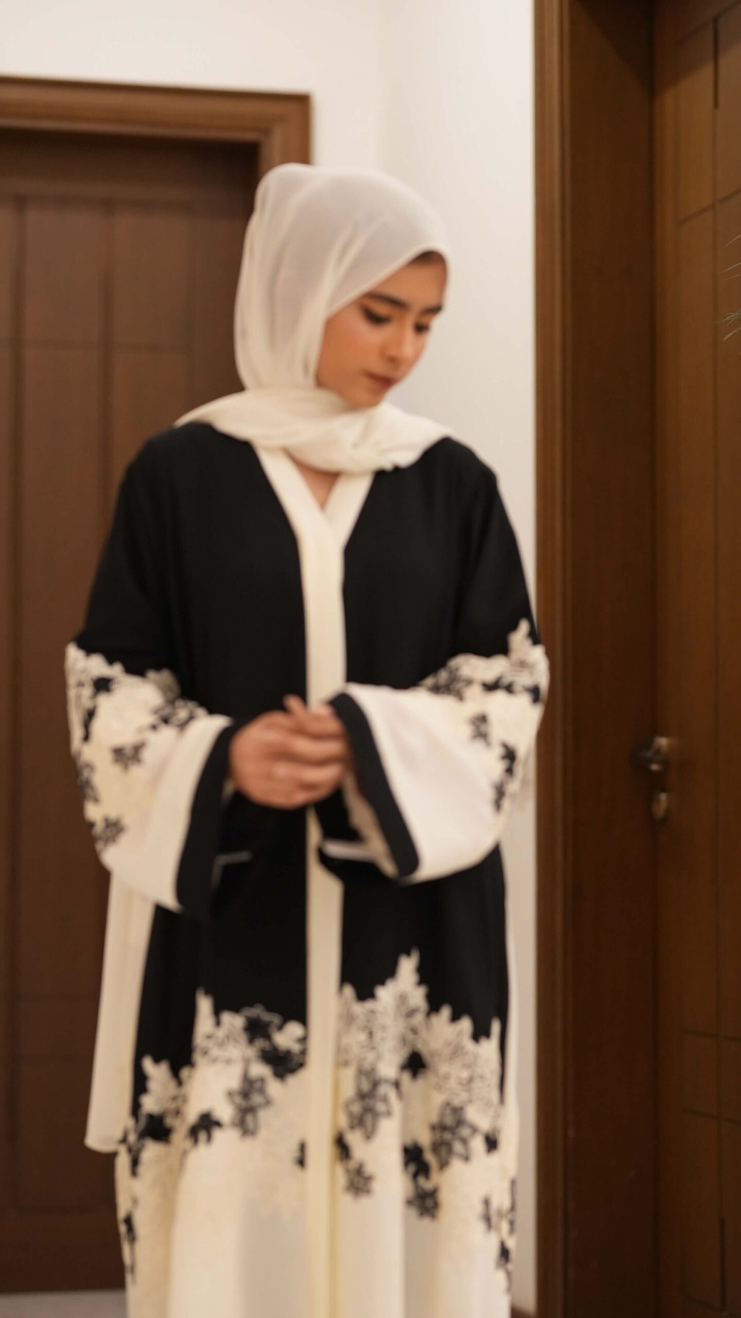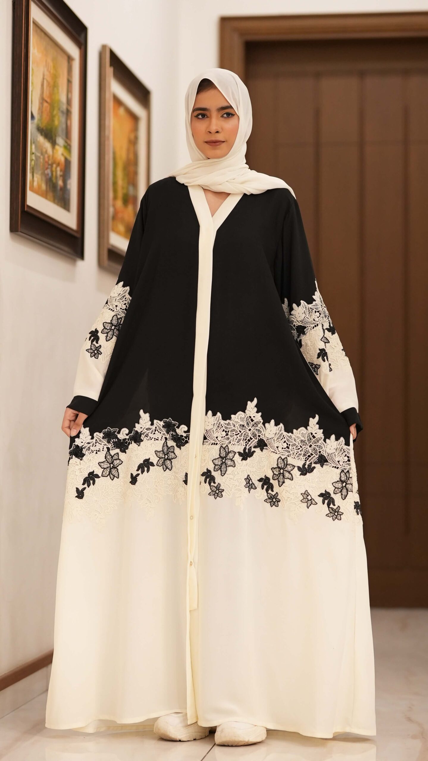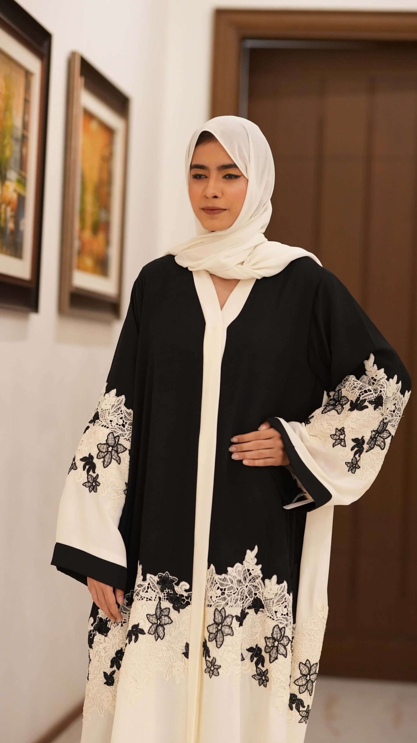 Embrace timeless elegance with the Floral Cascade Abaya. This exquisite garment blends classic modesty with contemporary design, creating a sophisticated statement piece for any occasion. The striking contrast of rich black and soft cream/off-white cascades gracefully, drawing the eye to the intricate black floral embroidery that adorns the bodice and sleeves.