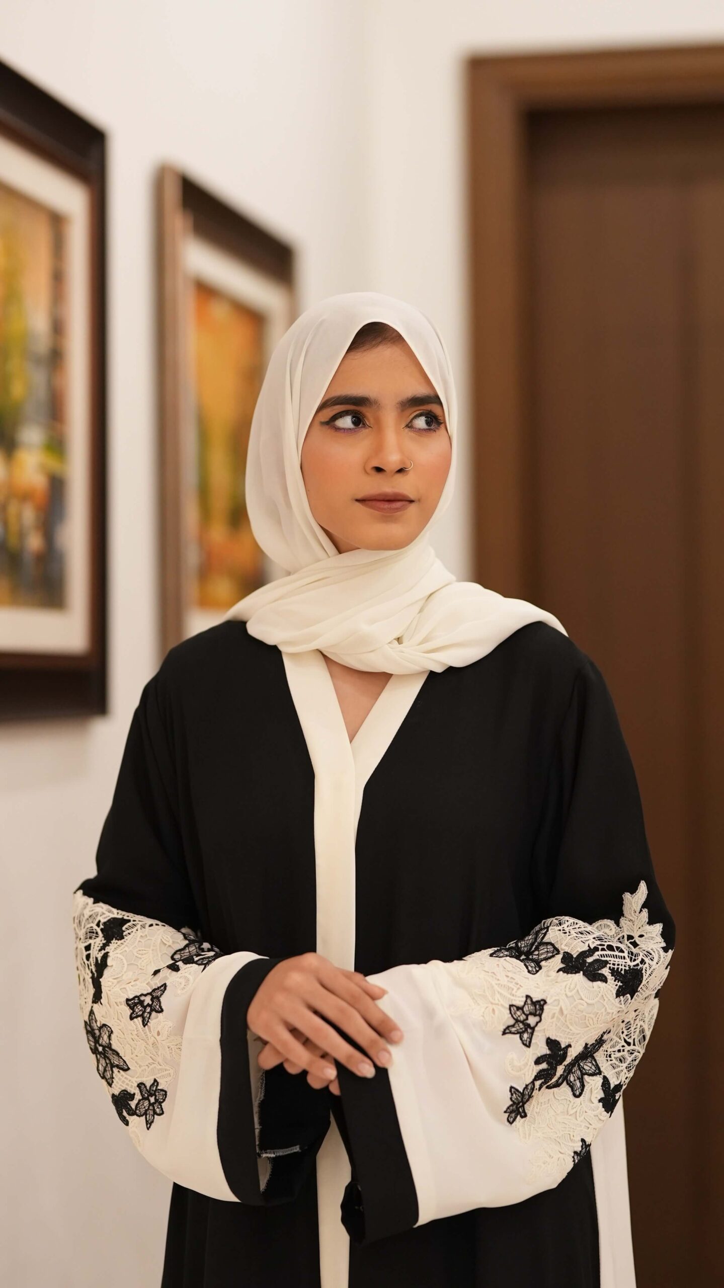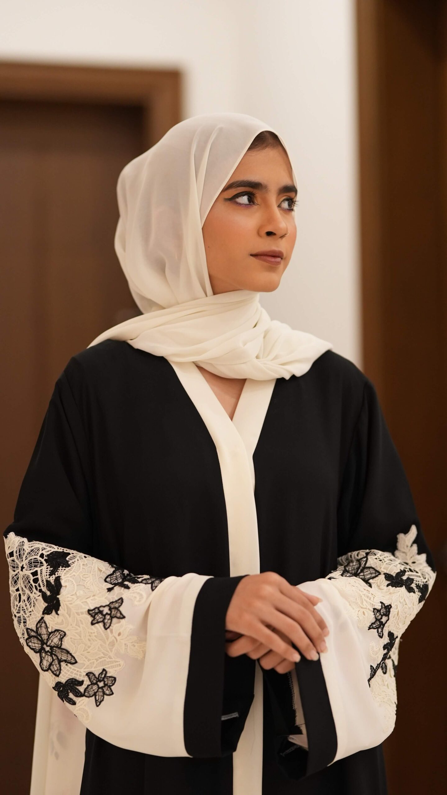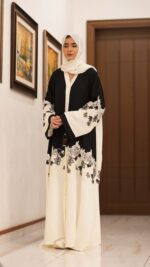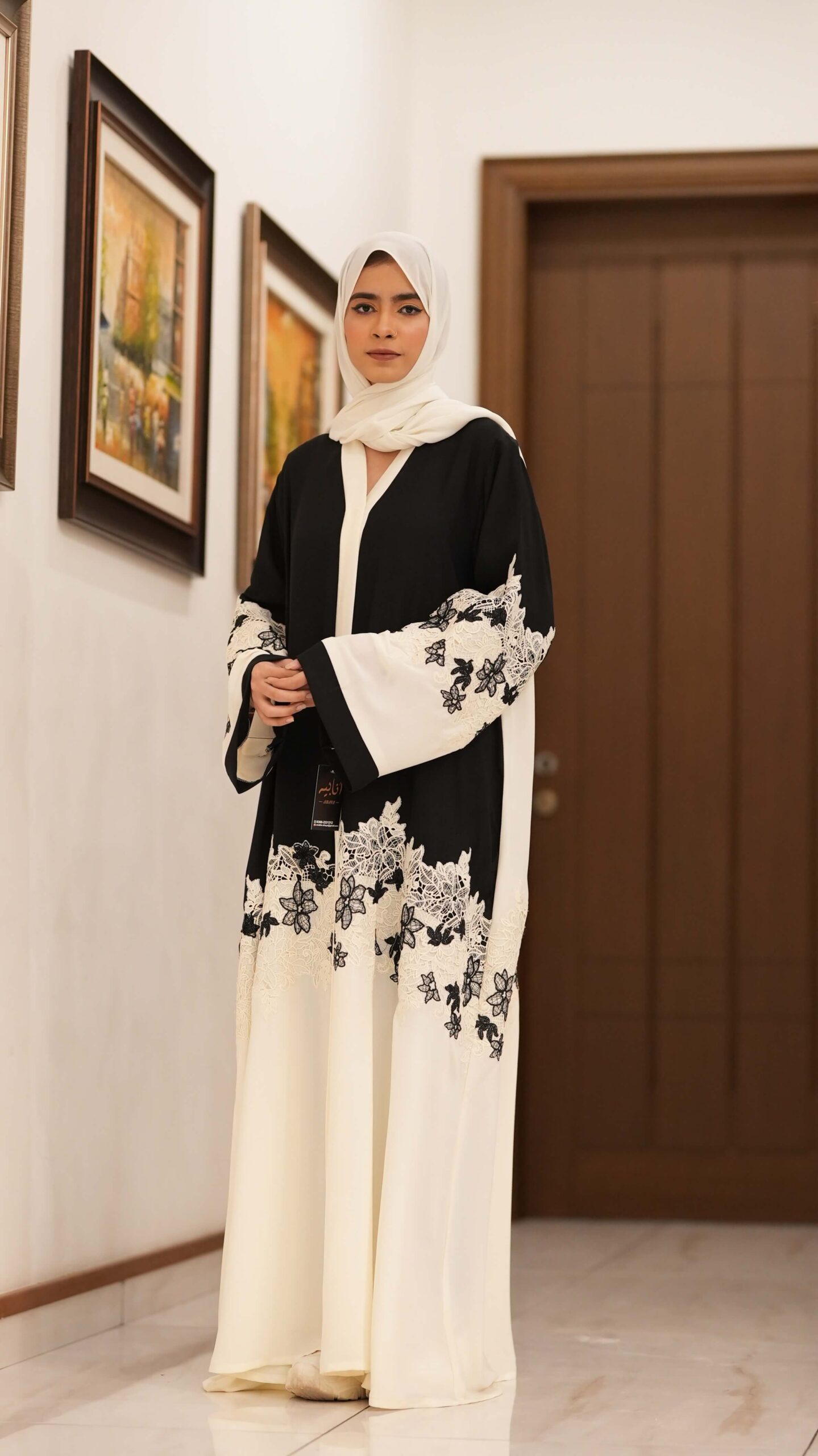 Embrace timeless elegance with the Floral Cascade Abaya. This exquisite garment blends classic modesty with contemporary design, creating a sophisticated statement piece for any occasion. The striking contrast of rich black and soft cream/off-white cascades gracefully, drawing the eye to the intricate black floral embroidery that adorns the bodice and sleeves.