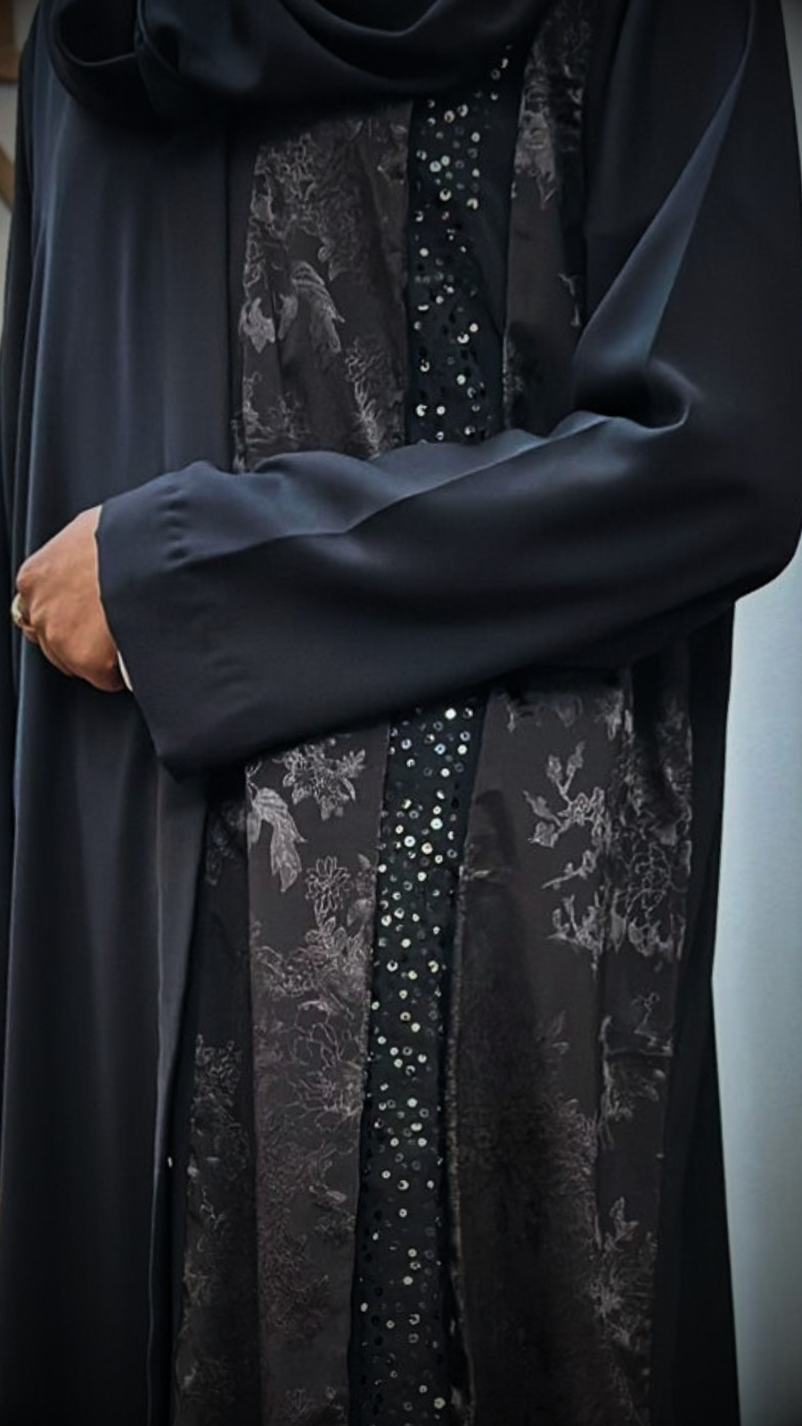 Title: Floral Damask Open Abaya with Lavender Inner Dress & Hijab