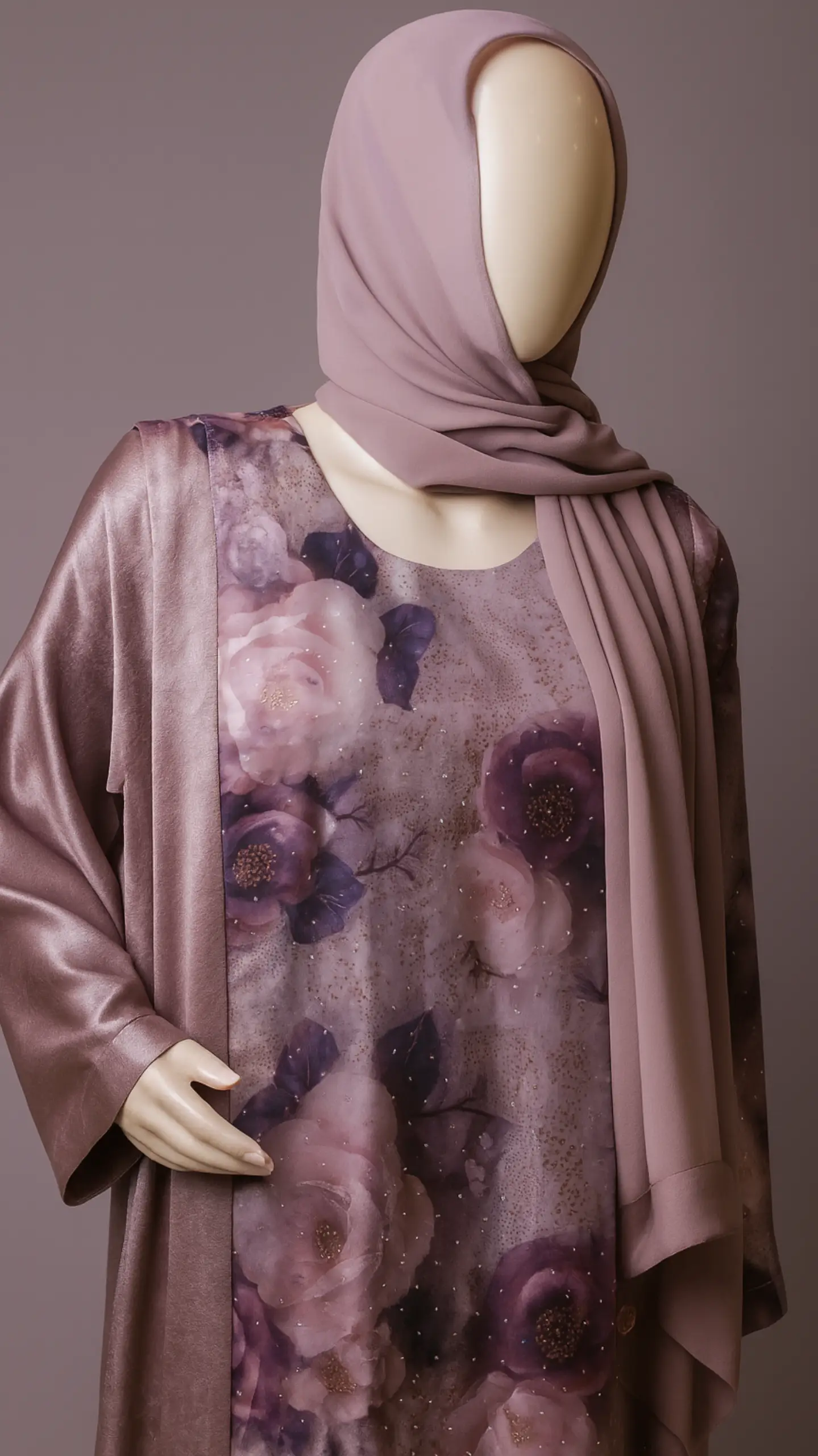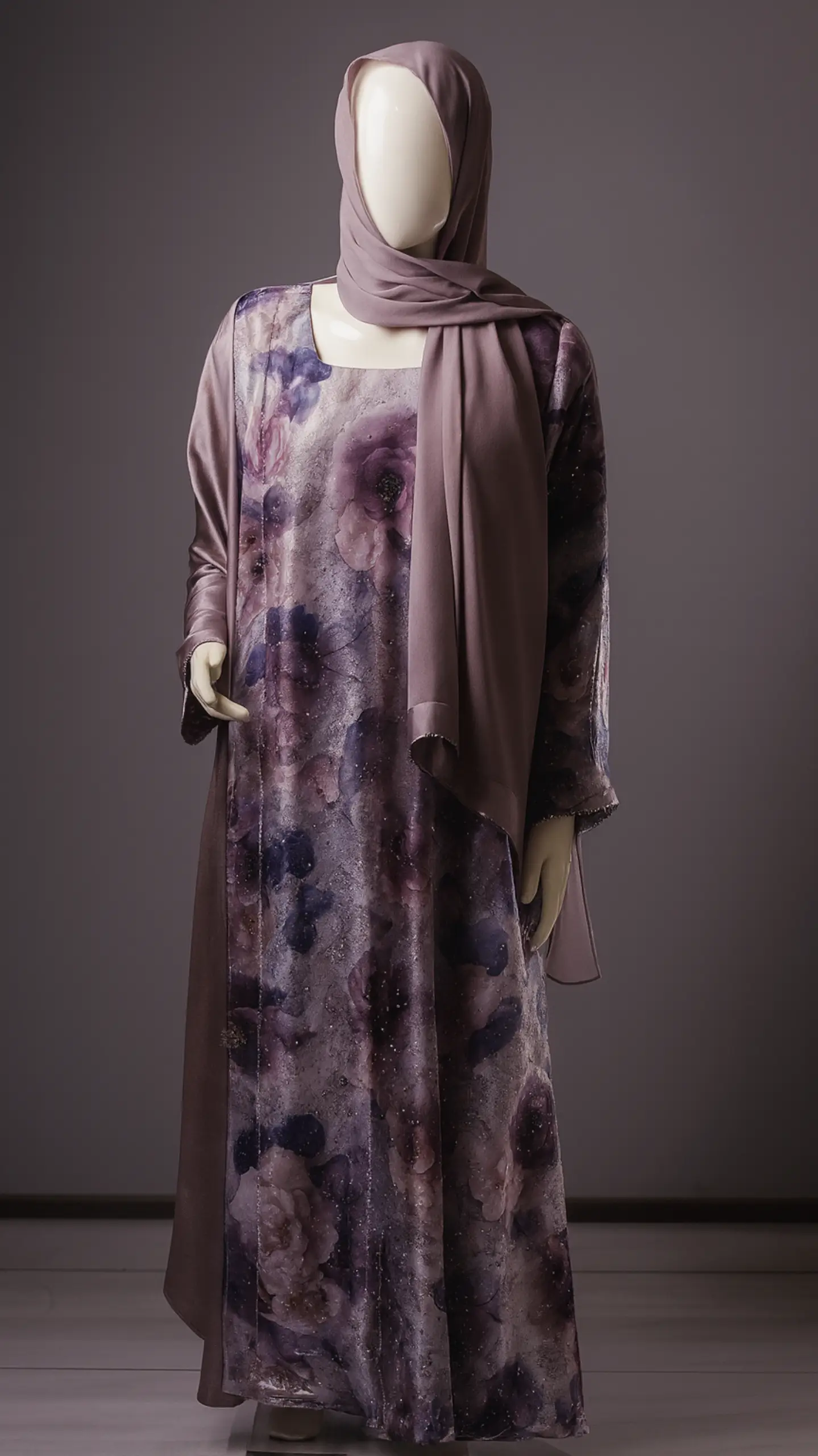 Crafted from a luxurious, flowing fabric, the abaya offers a graceful drape and comfortable fit. It’s perfectly complemented by a matching plain lavender-rose long scarf, designed to complete your modest yet fashionable look. The long sleeves are finished with a plain cuff, mirroring the solid panels that run along the sides, providing a refined contrast to the beautiful print