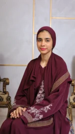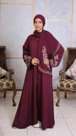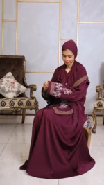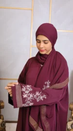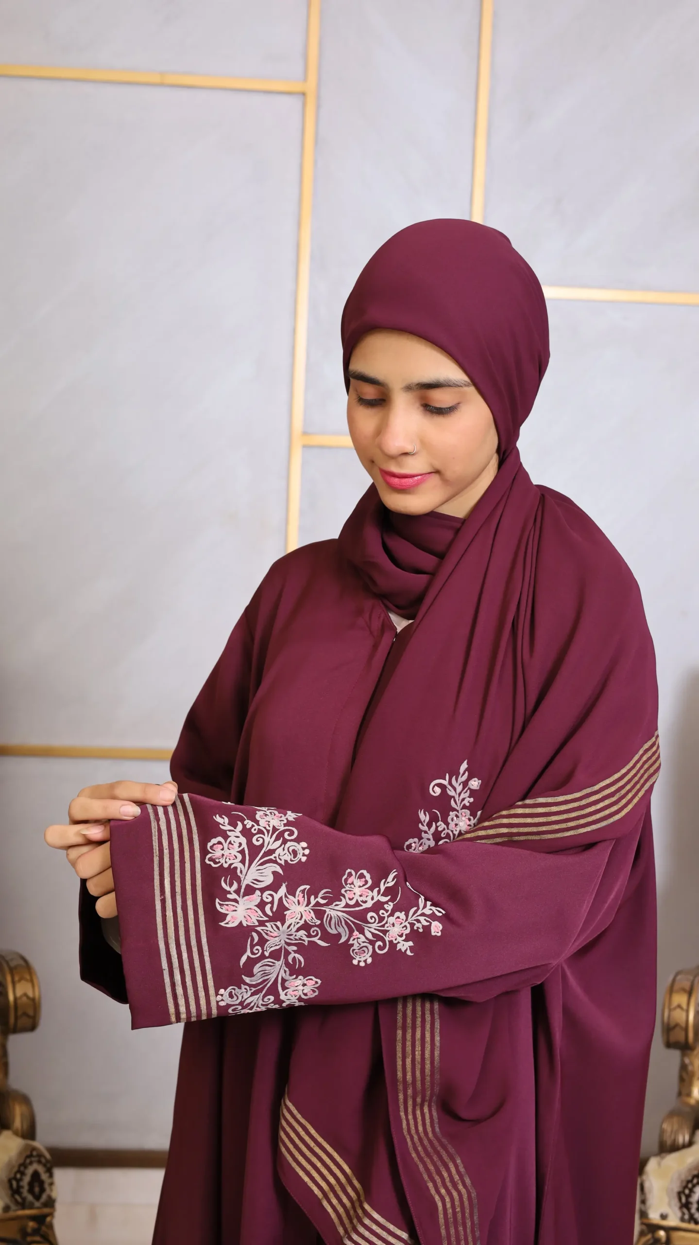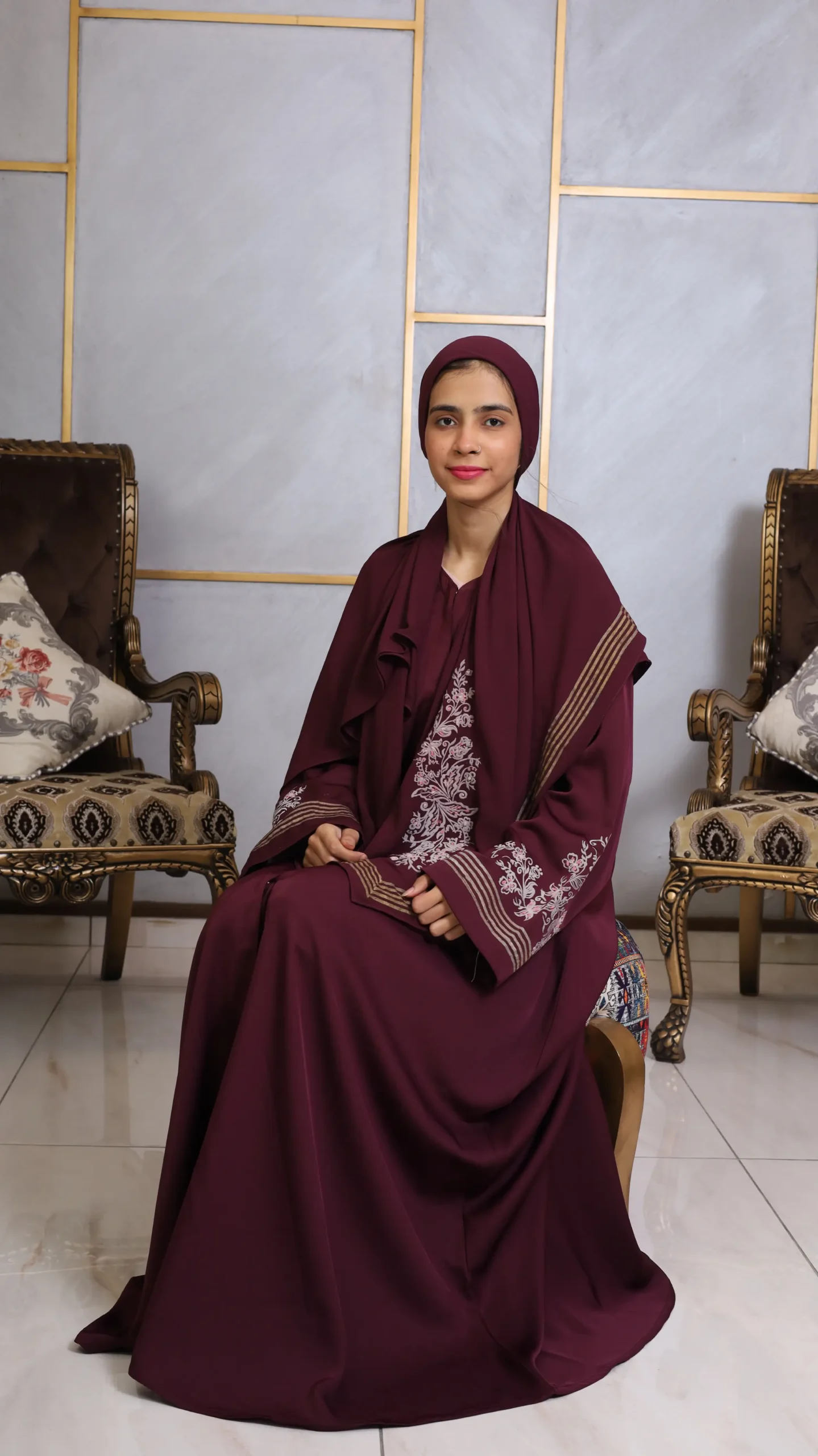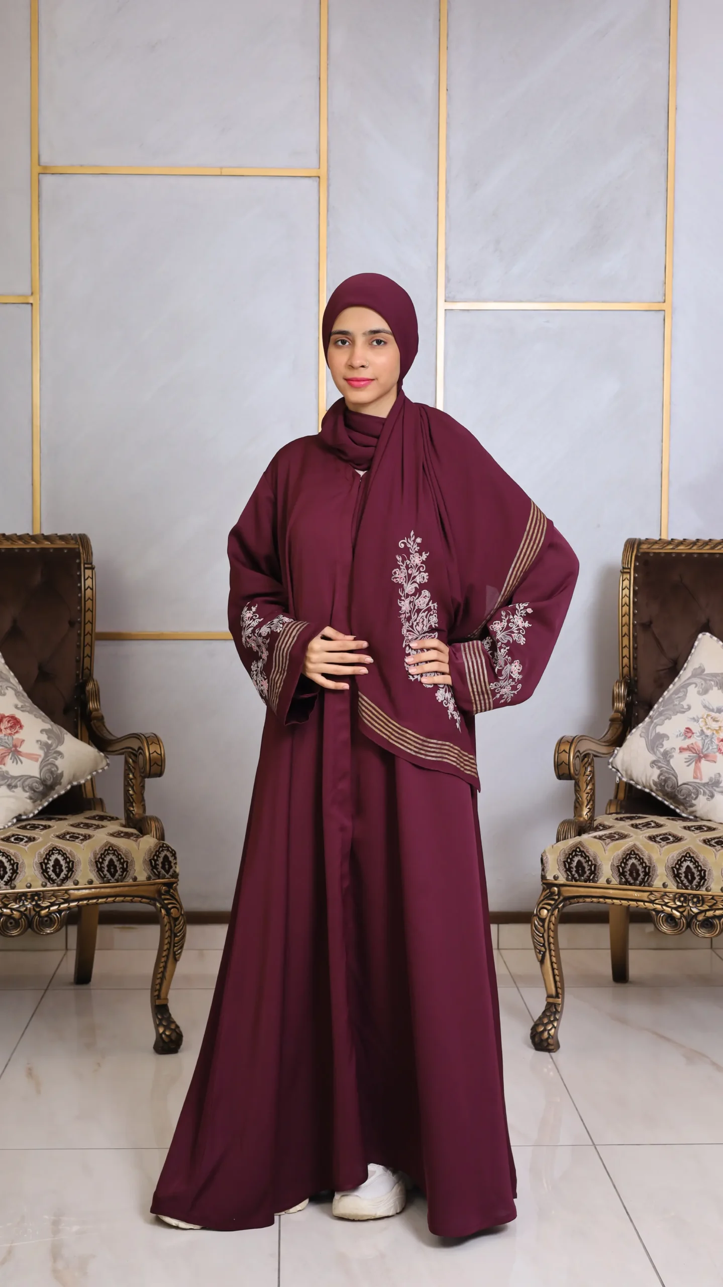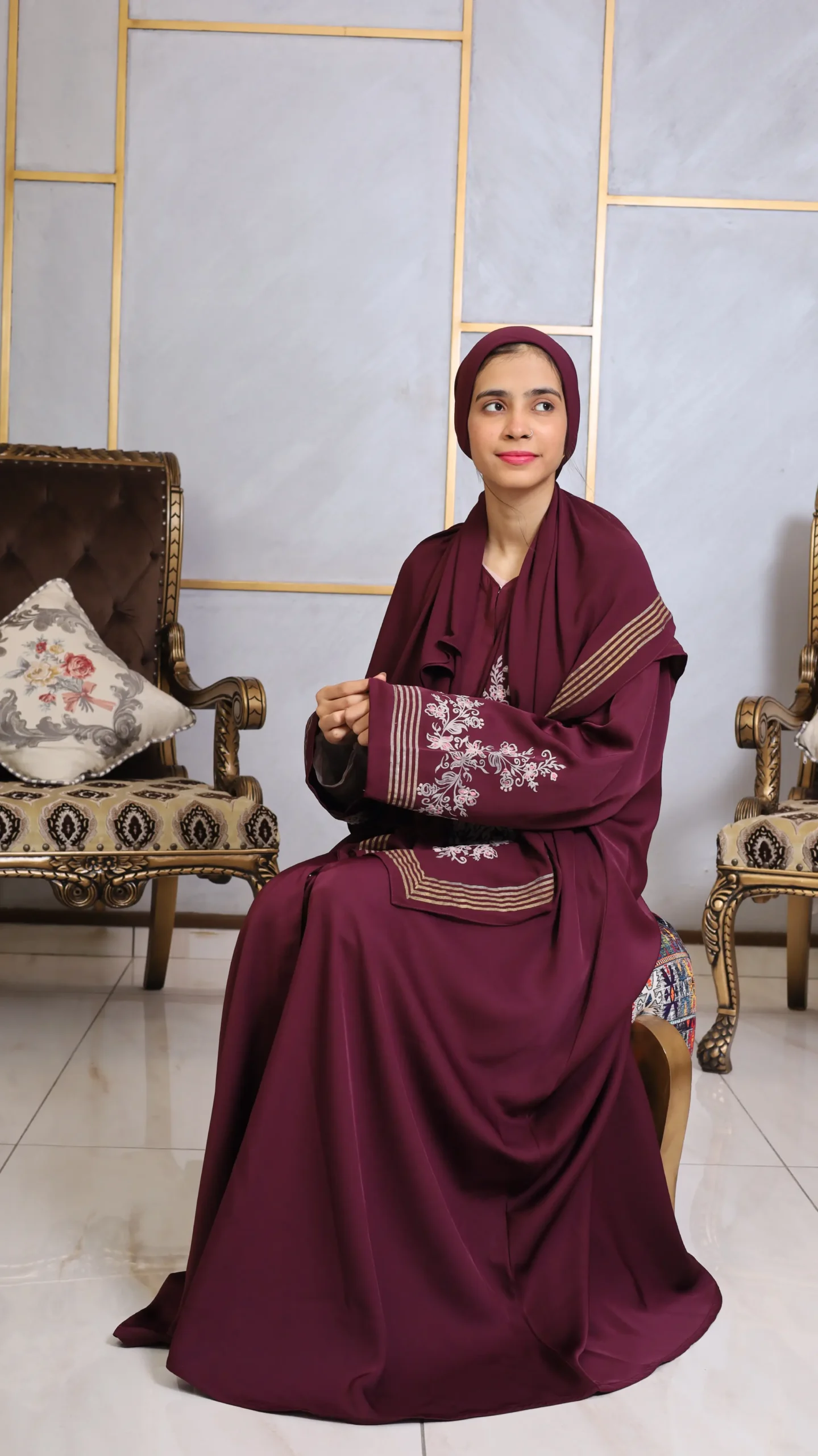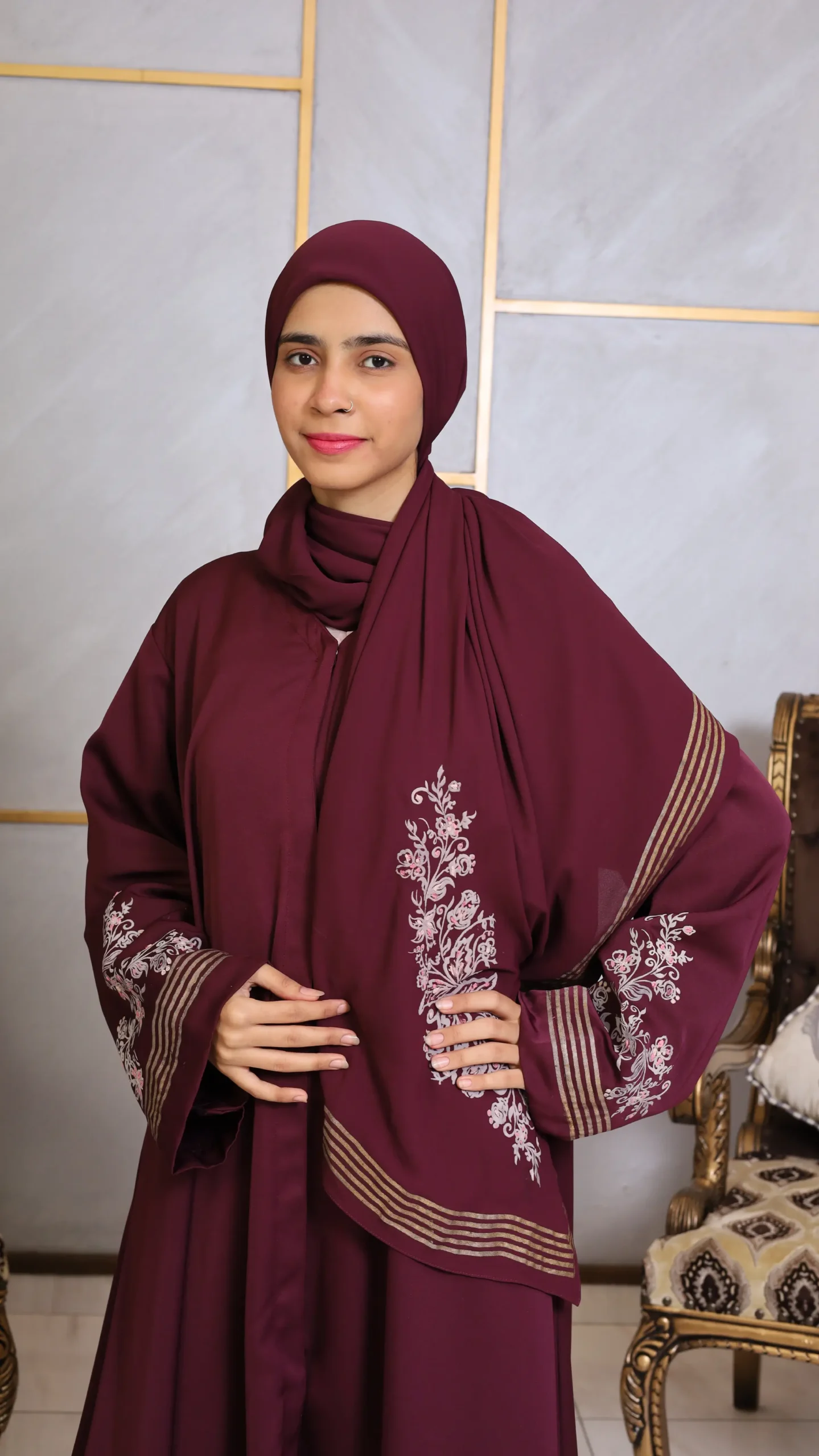 Embrace timeless elegance with our Maroon Majesty Abaya. Crafted from luxuriously smooth fabric, this abaya drapes with a graceful flow, offering both comfort and sophistication. The rich maroon hue exudes a regal charm, elevated by delicate floral embroidery in shimmering silver that adorns the sleeves and chest. Bands of subtle gold detailing add a touch of opulence, catching the light with every movement. Complete your look with the matching maroon hijab, designed for perfect coverage and effortless style. The Maroon Majesty Abaya is a statement of refined modesty, perfect for special occasions or adding a touch of everyday luxury to your wardrobe.