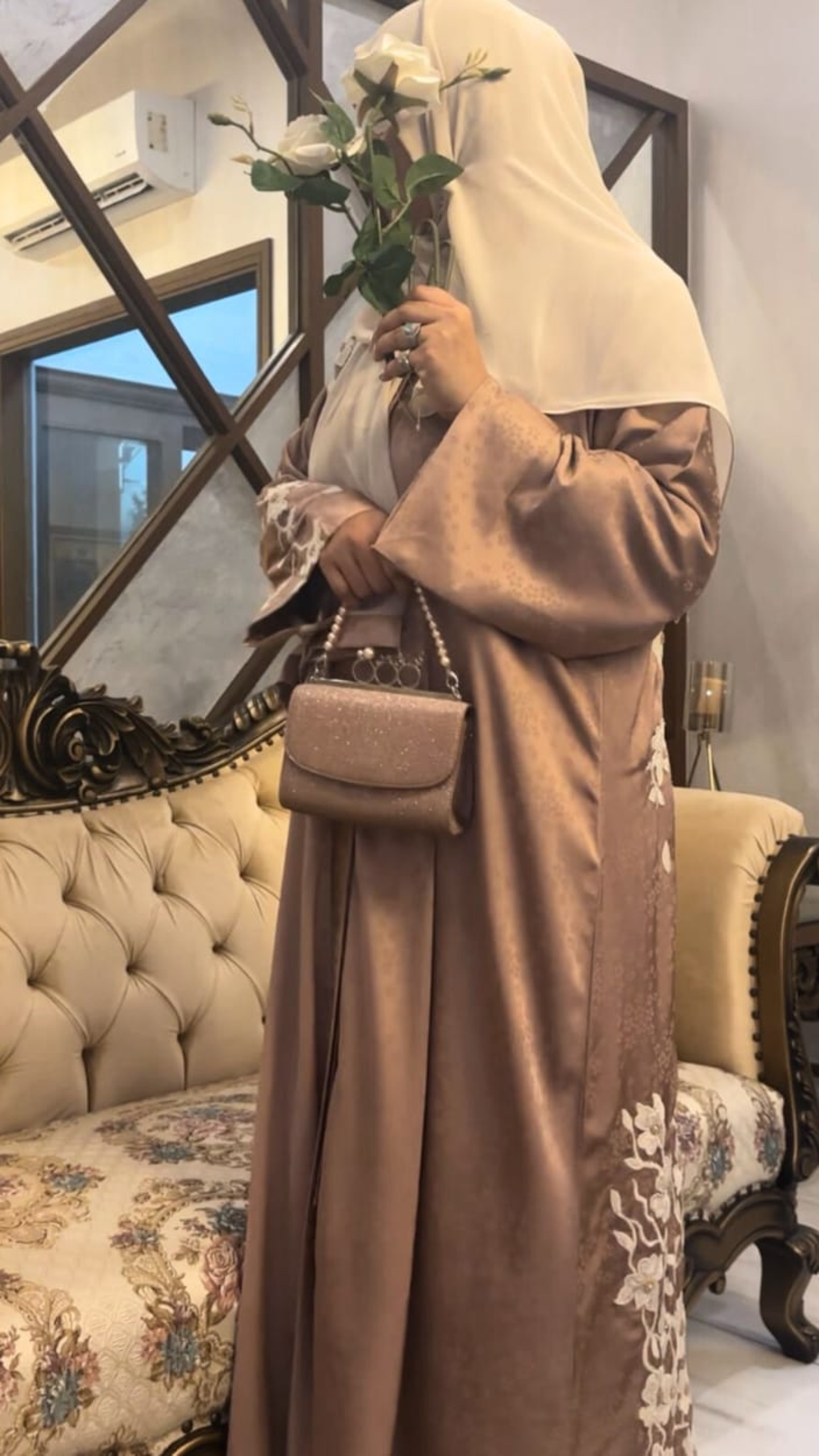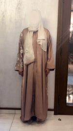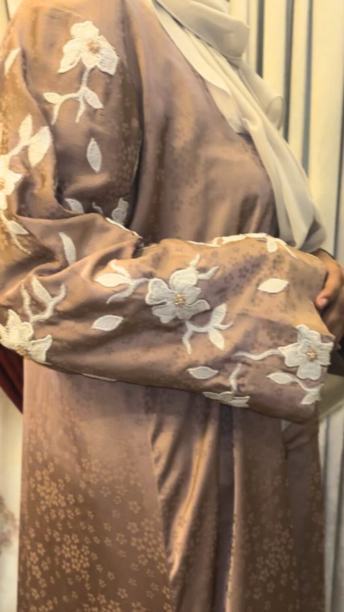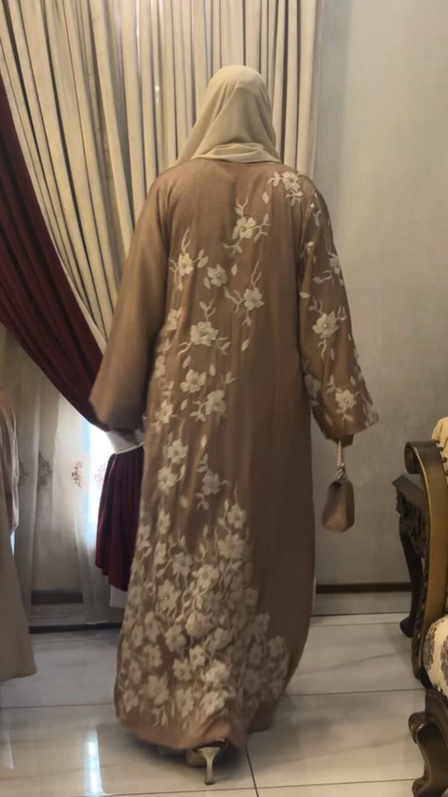 Crafted in refined dusty beige silk, the Meerah Abaya embodies effortless luxury. Its minimalist front contrasts beautifully with white floral embroidery along the sleeves and back, creating a soft, elegant statement.