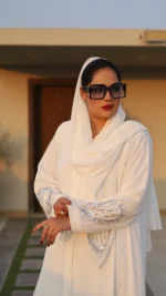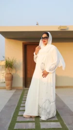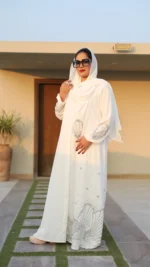 Glide down the aisle in a vision of pure grace with our Ethereal Wedding Abaya. This pristine white masterpiece is more than just a garment; it’s a statement of timeless elegance and radiant beauty.