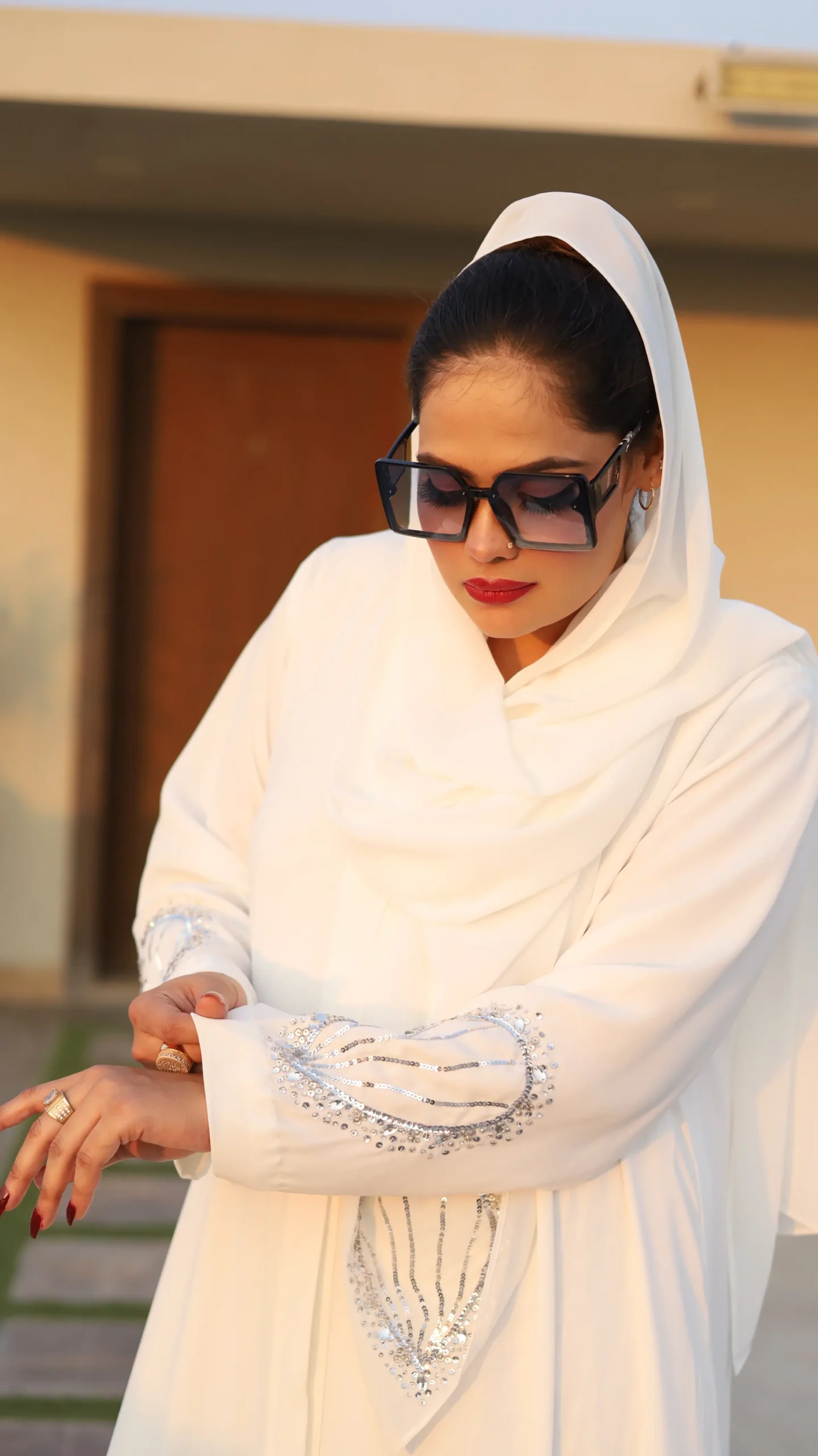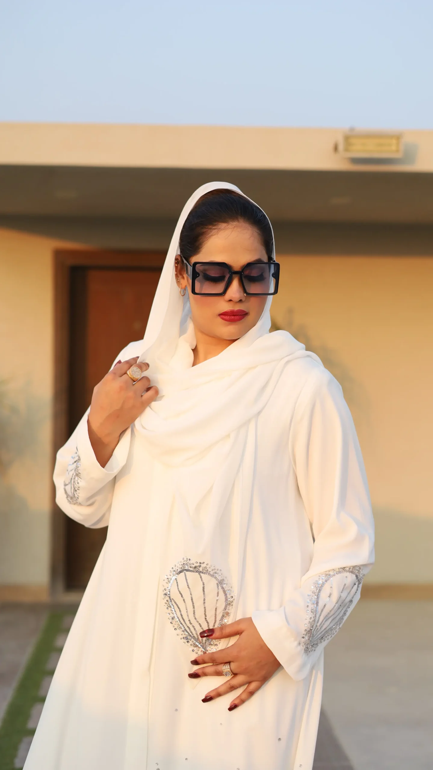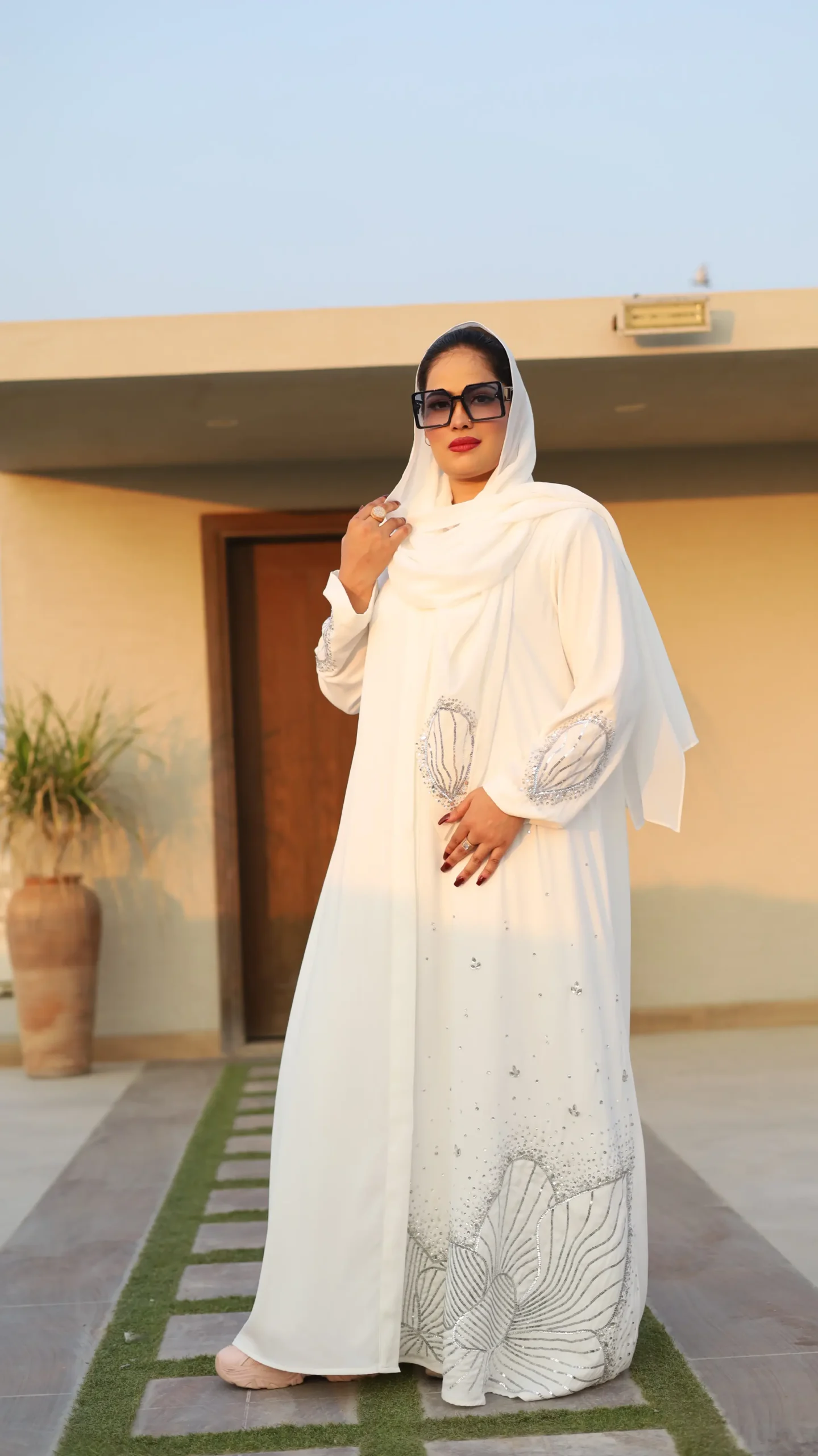 This abaya is designed for the modern bride who embraces tradition with a touch of contemporary flair. Pair it with a simple white hijab for a classic look, or add a pop of color with bold lipstick and statement sunglasses for a truly unique expression of your personal style.