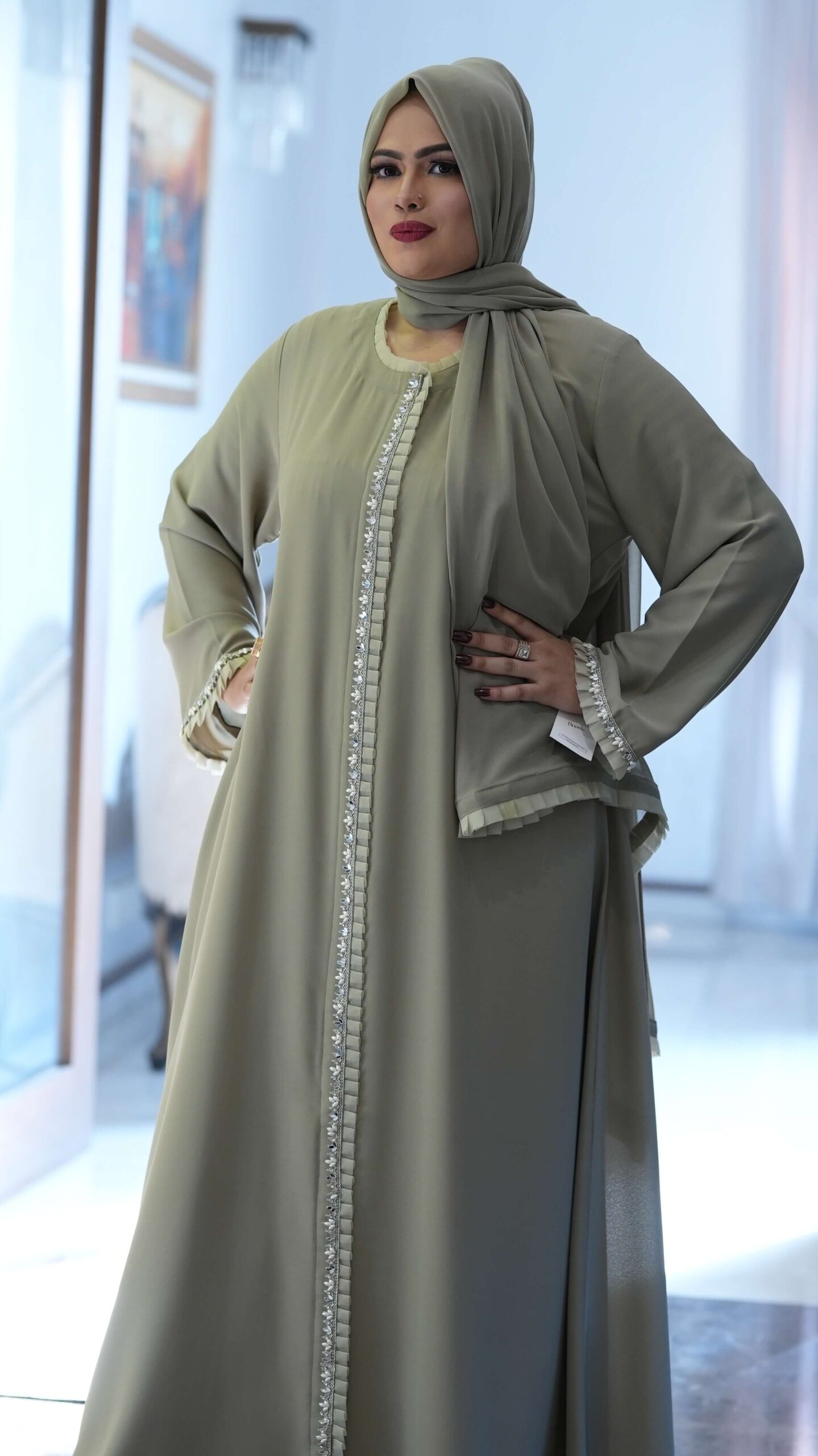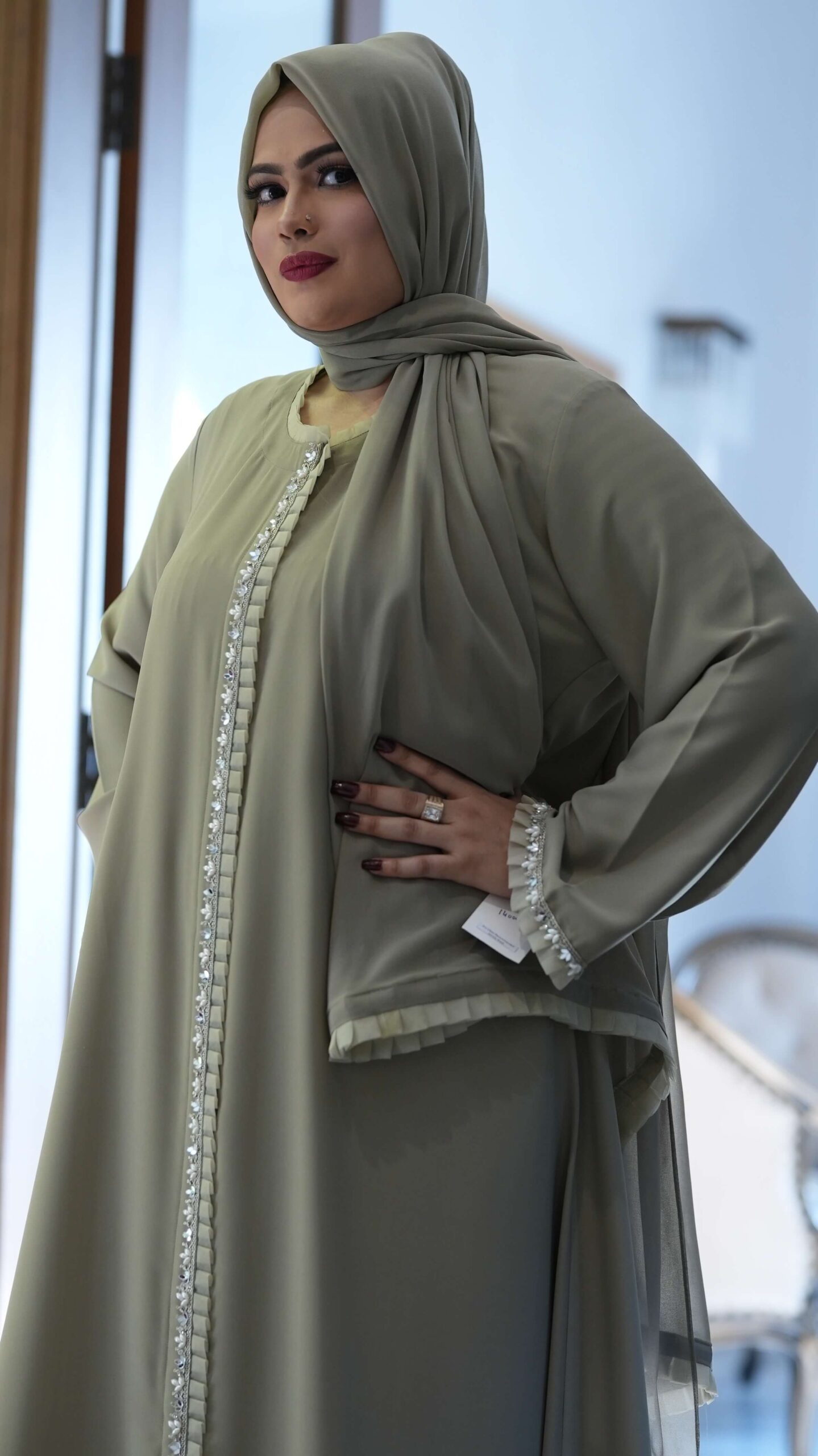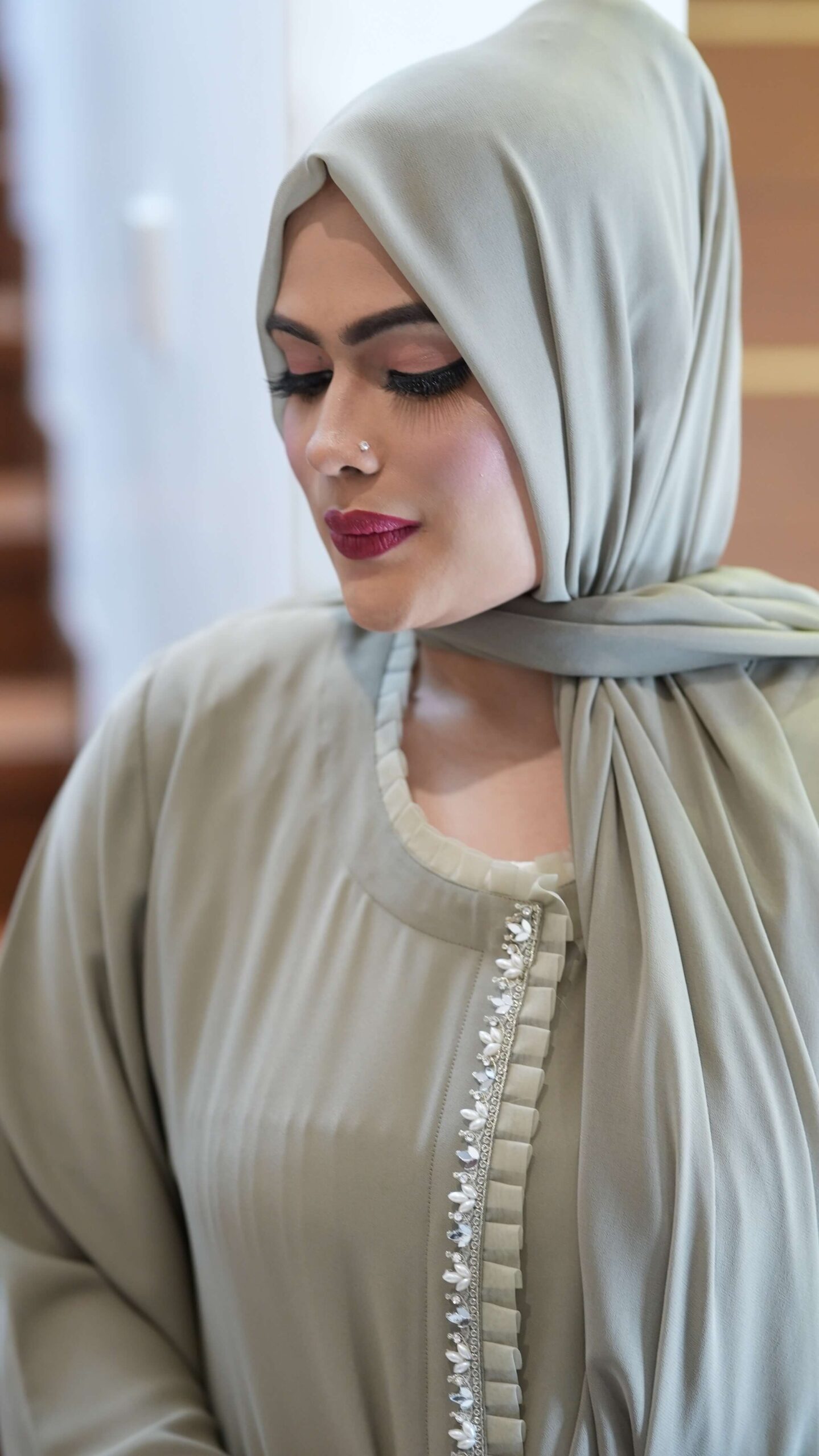 Embrace understated elegance with the Sage Serenity Abaya. Draped in a whisper-soft sage green, this abaya offers a tranquil sophistication. The delicate pearl and ruffled trim along the front and cuffs adds a touch of ethereal beauty, catching the light with every graceful movement. Crafted from a lightweight, subtly sheer fabric, it flows effortlessly, ensuring both comfort and modesty. Paired with a matching hijab, the Sage Serenity Abaya creates a harmonious and refined ensemble, perfect for moments when you desire to radiate serene confidence and timeless grace. Let your inner light shine through.