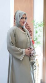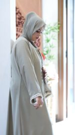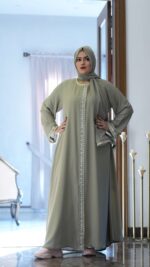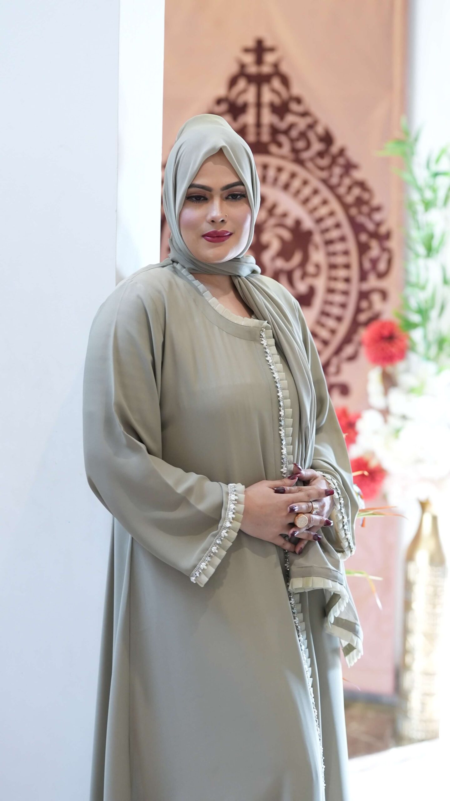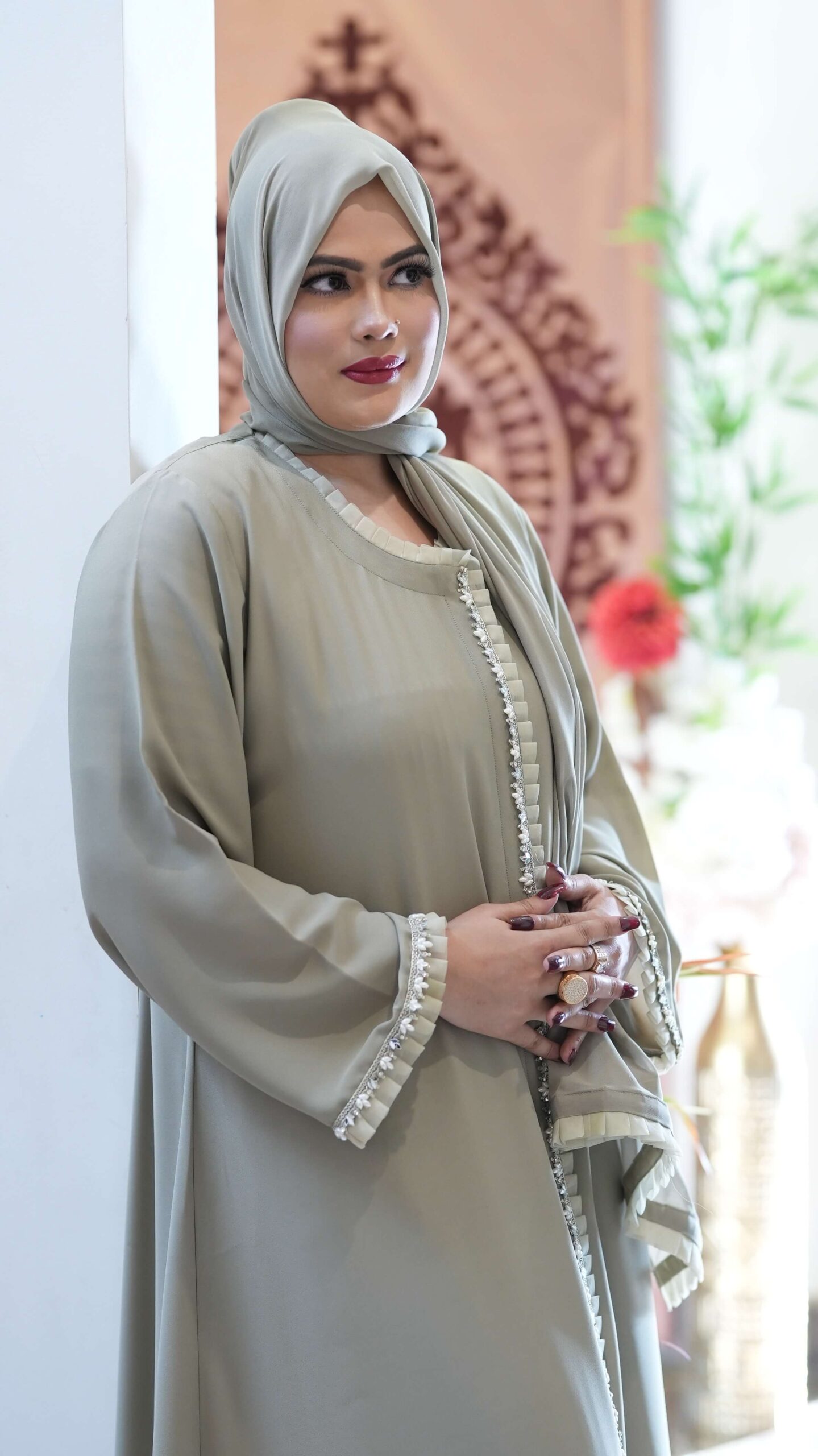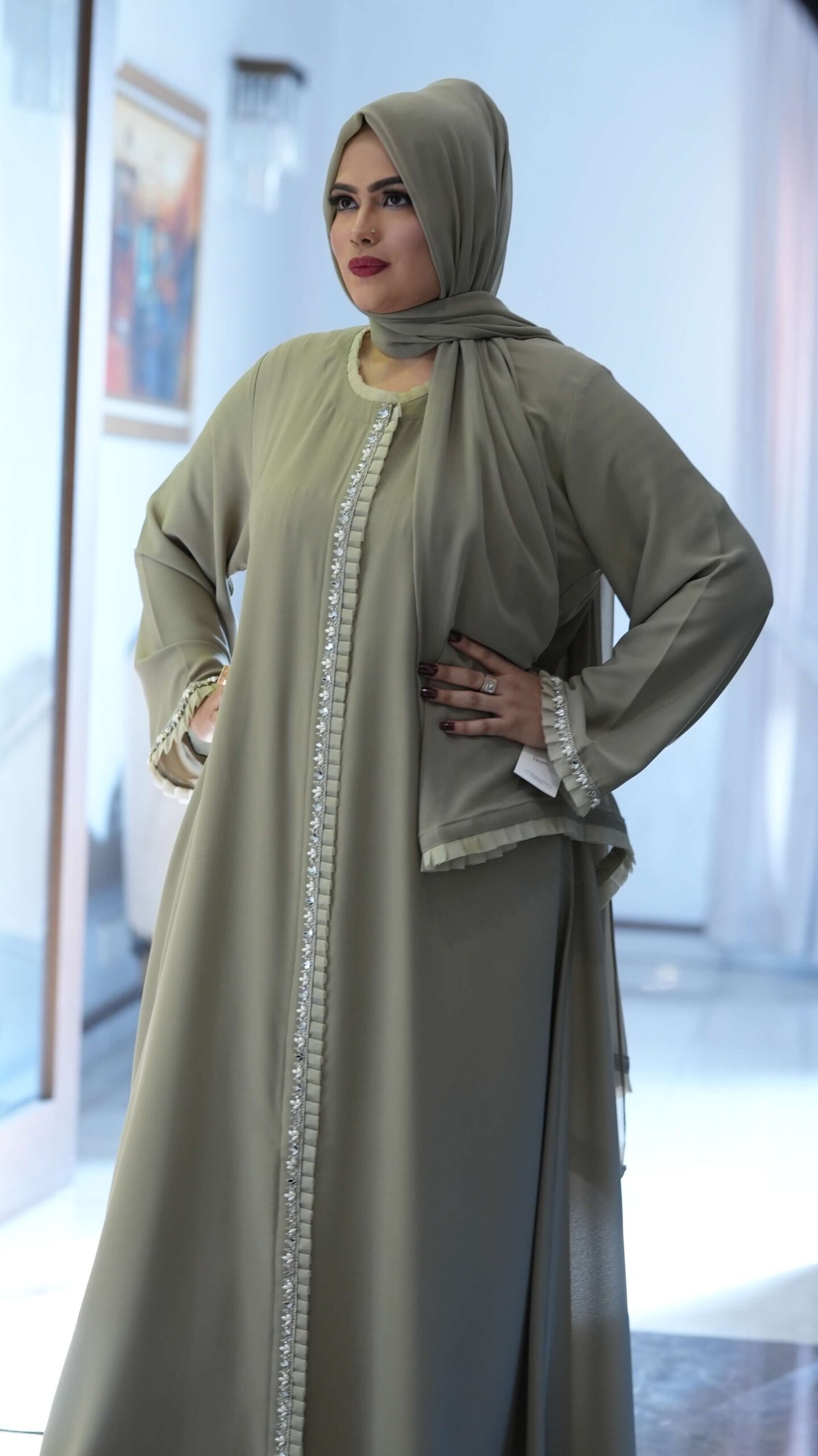 Embrace understated elegance with the Sage Serenity Abaya. Draped in a whisper-soft sage green, this abaya offers a tranquil sophistication. The delicate pearl and ruffled trim along the front and cuffs adds a touch of ethereal beauty, catching the light with every graceful movement. Crafted from a lightweight, subtly sheer fabric, it flows effortlessly, ensuring both comfort and modesty. Paired with a matching hijab, the Sage Serenity Abaya creates a harmonious and refined ensemble, perfect for moments when you desire to radiate serene confidence and timeless grace. Let your inner light shine through.