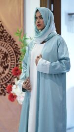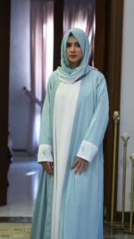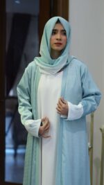 The whisper-soft, light blue abaya drapes beautifully, catching the light with its subtle sheen, while delicate white embroidered cuffs add a touch of refined detail. Paired with a comfortable, long-sleeved white inner dress, this set offers complete coverage and effortless sophistication. The matching light blue hijab completes the look, creating a harmonious and graceful silhouette.