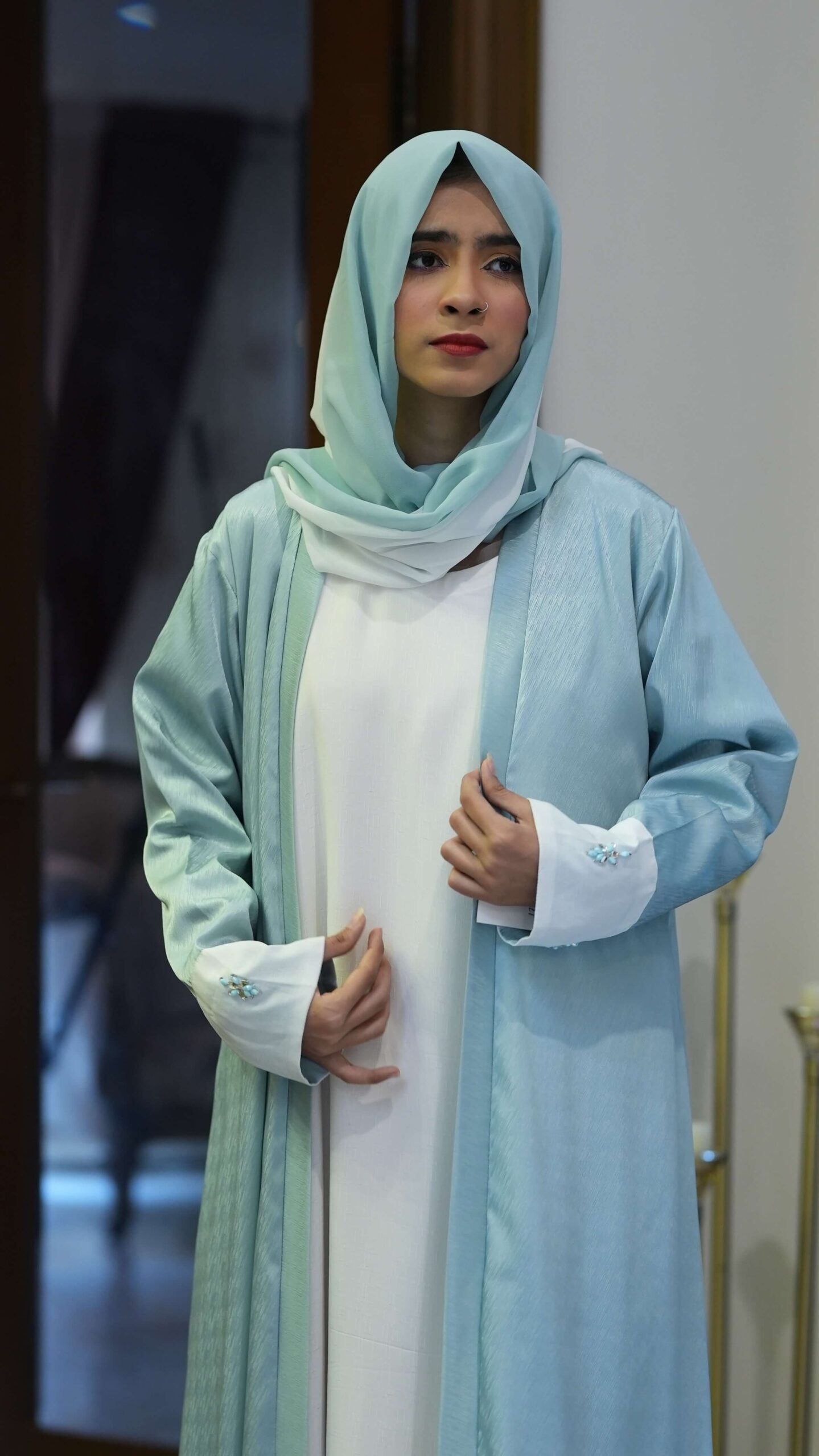 Embrace understated elegance with the Serene Azure Abaya Set. This exquisite ensemble, featuring a flowing light blue abaya and a pristine white inner dress, is designed for the modern woman who values both modesty and style.