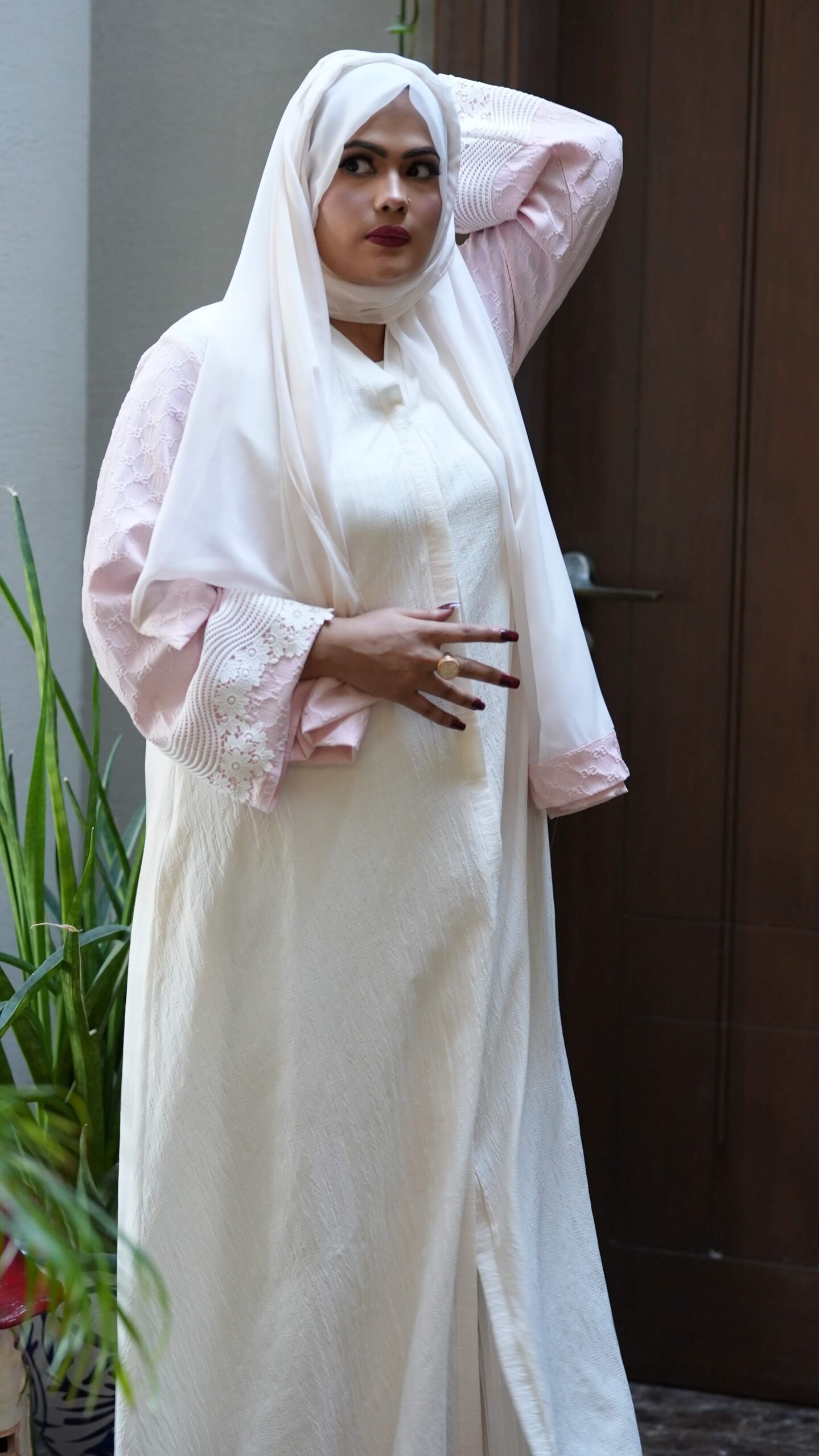 The flowing silhouette, in a soft cream hue reminiscent of dawn, drapes effortlessly, offering both comfort and graceful movement. Delicate light pink accents adorn the sleeves, a subtle touch of femininity that catches the eye without overwhelming. The intricate white lace detailing at the cuffs adds a timeless charm, a nod to tradition reimagined for the modern soul.