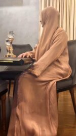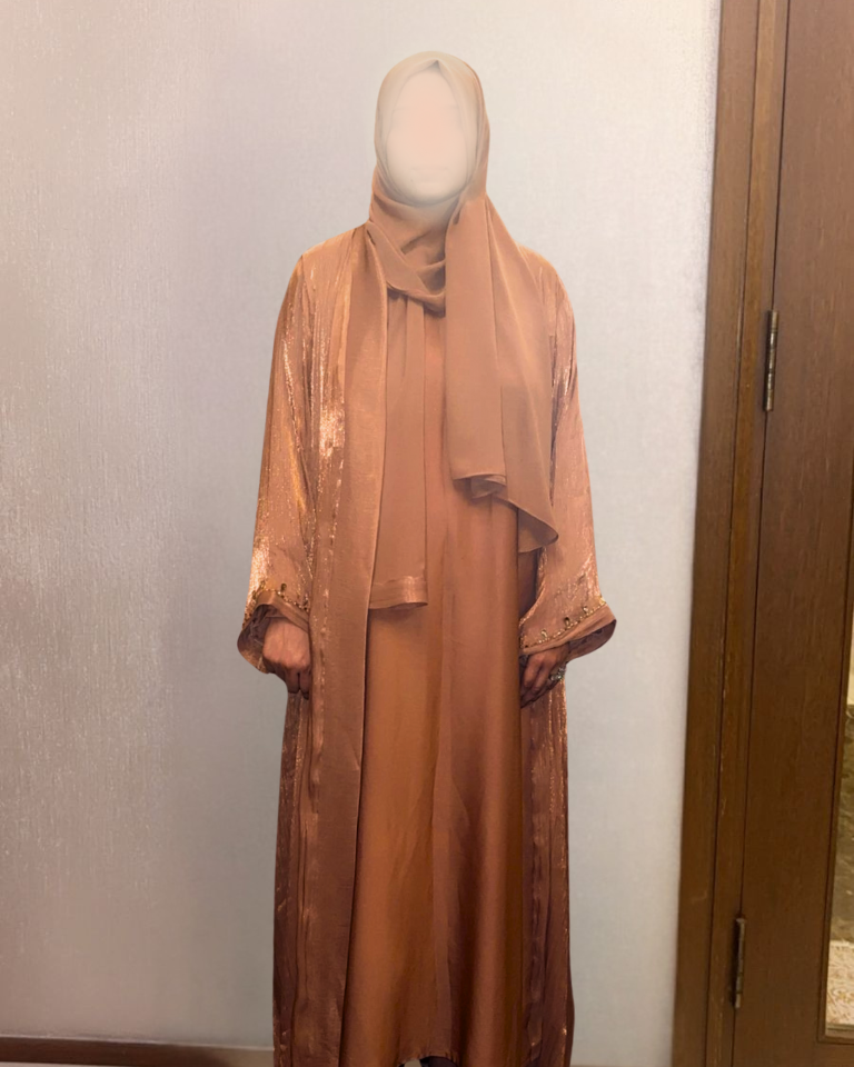 Crafted in a warm orange-rust hue, this silk abaya embodies luxury through its lustrous texture and graceful flow.