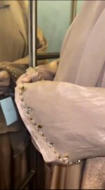 Design: Fluid silhouette with embellished sleeve detailing for a graceful festive touch
