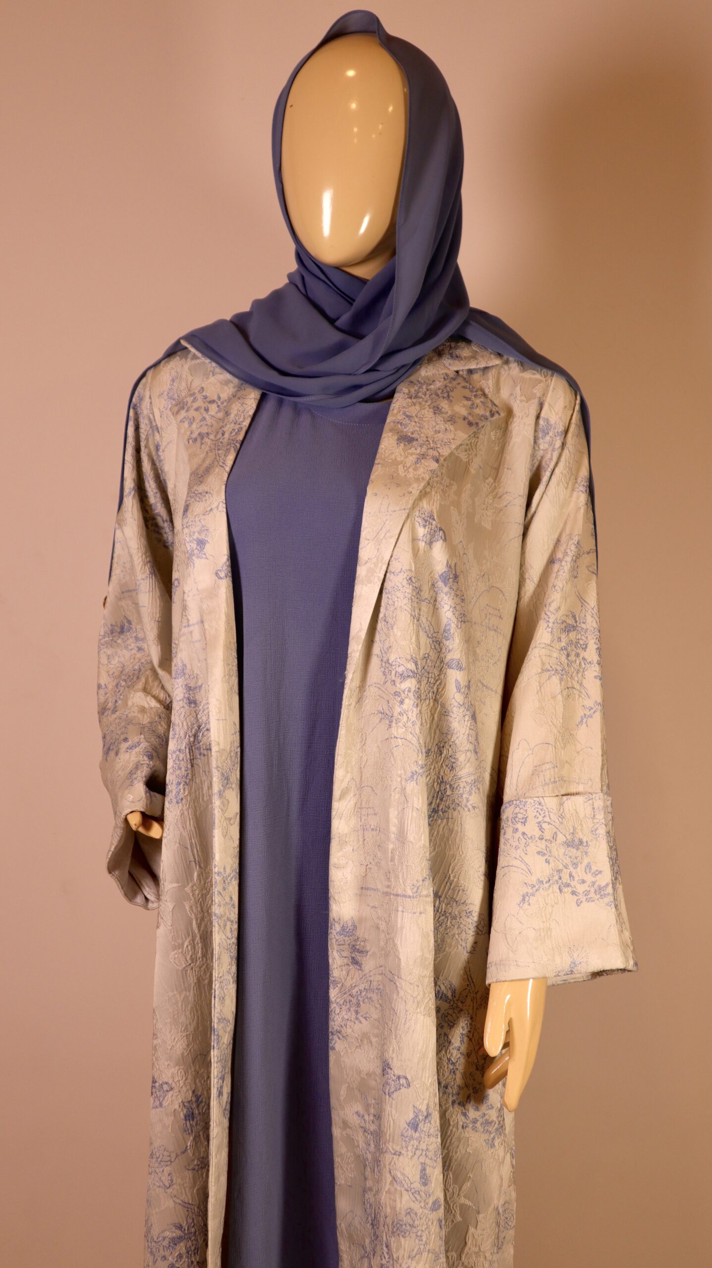 Design: Open abaya with floral detailing paired with a lavender inner dress