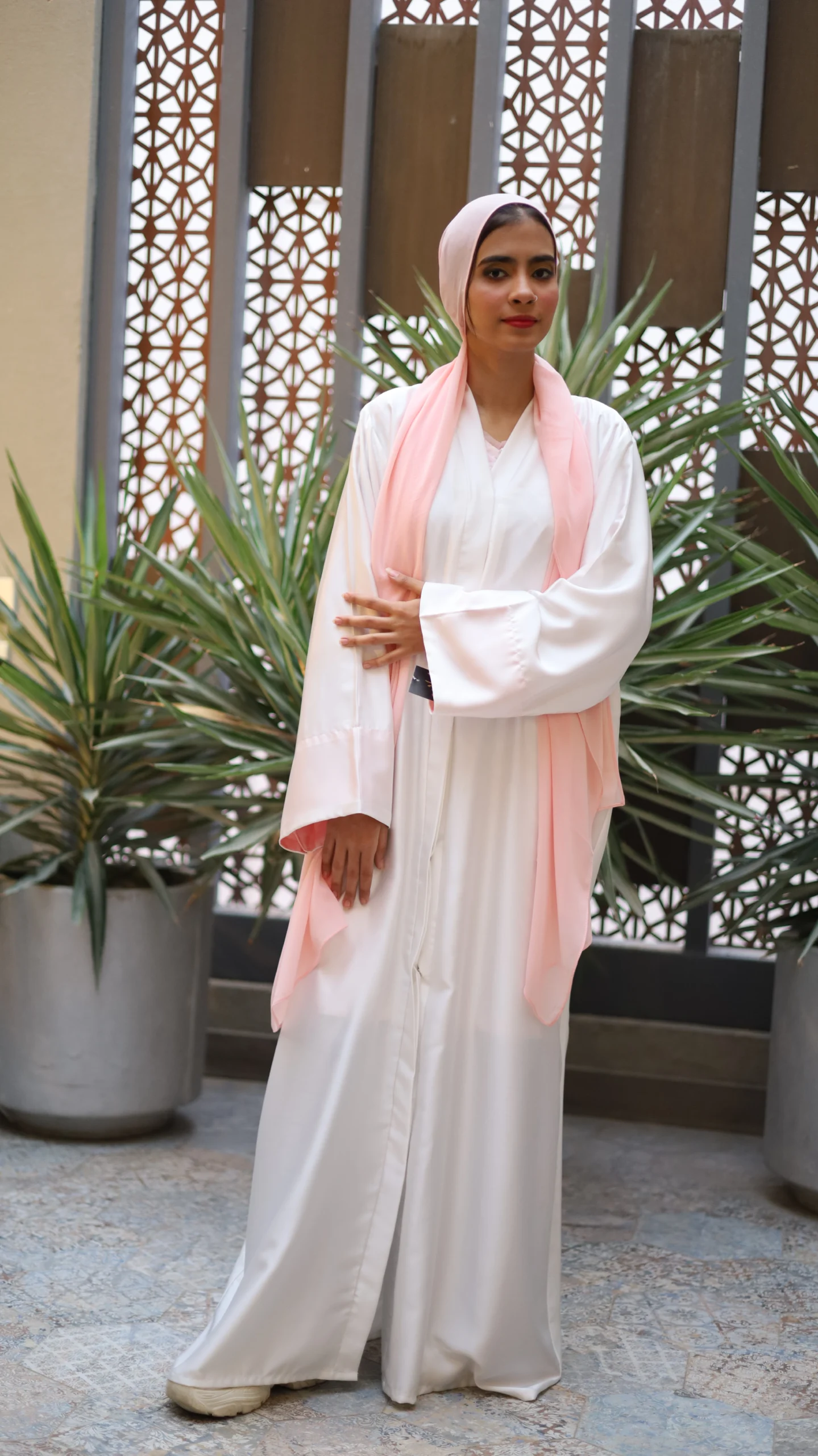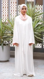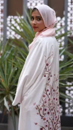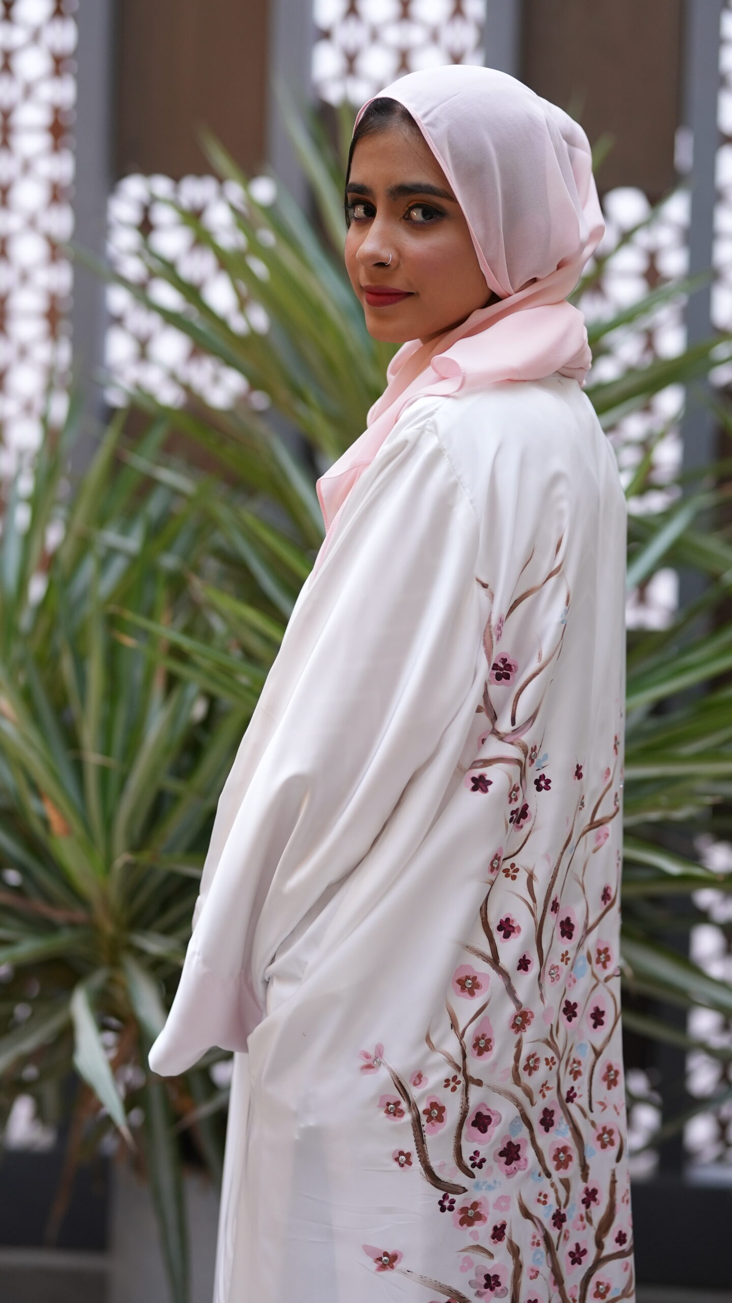 Wrap yourself in the ethereal beauty of the Whispers of Spring Abaya. This flowing masterpiece, crafted from the finest ivory fabric, drapes like a dream and whispers of timeless elegance.