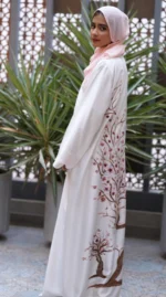 Imagine strolling through a blossoming orchard, the gentle breeze carrying the scent of spring. This abaya captures that very essence with its hand-painted design of delicate trees, their branches reaching towards the heavens. Earthy brown trunks anchor the design, while blush-pink and deep burgundy blossoms burst forth in a symphony of color.